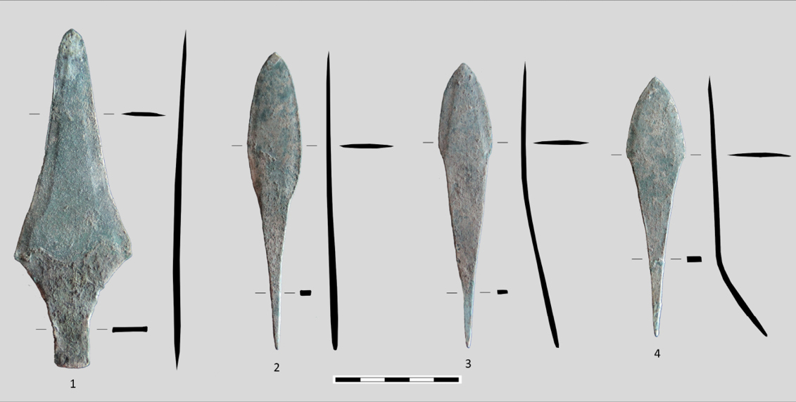 The votive assemblage associated to this individual comprised a tongue dagger and three Palmela arrowheads (fig. 3, tab. 1). The dagger has a sub-triangular blade, with a “Eiffel Tower” shape, and presents a central vein that follows the general outline and the edges slightly marked. The peduncle has the edges slightly hammered, producing a rectangular section. The Palmela point (2) has an oval and elongated blade, with thin edges that follow the general shape. The peduncle is triangular with a rectangular section. The two other Palmela points are slightly different, but closer to each other. The shape of the head is ogival, with large and well demarcated edges. The rest of the body is triangular and undifferentiated from the peduncle, that is of rectangular section.