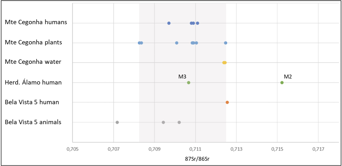 Finally, the issue of mobility. In face of the present available data it is hard to value the isotopic results obtained for the male of Herdade do Álamo and the female of Bela Vista 5, both adults, buried 3 km away and providing radiocarbon dates practically identical. They are the only individuals analysed for 87Sr/86Sr for the late 3rd millennium BC in South Portugal. If the female of Bela Vista 5 seems to be local, the results for the male of Herdade do Álamo shows mobility in youth, indicating a possible foreign origin to the local area. A movement, though, that might not have represented a grate displacement, since the values that fell out of the local range are, for instance, within the local range of Perdigões enclosure (Valera et al., 2020b), just 50km northwest. However, only with much more individuals analysed for this period and region these results may be properly valued. The approach to regional human mobility in the Late Prehistory of the South of Portugal has just recently started, with a first study of 69 individuals of Perdigões and some from local megalithic monuments (Valera et al., 2020b). A high degree of short and medium range mobility was detected for Perdigões during the Chalcolithic (second and third quarter of the 3rd millennium BC), results that must be valued having in consideration the nature of the site, interpreted manly as ceremonial aggregation centre, integrated in a large-scale interaction network, and with a significant capacity of attraction of people.