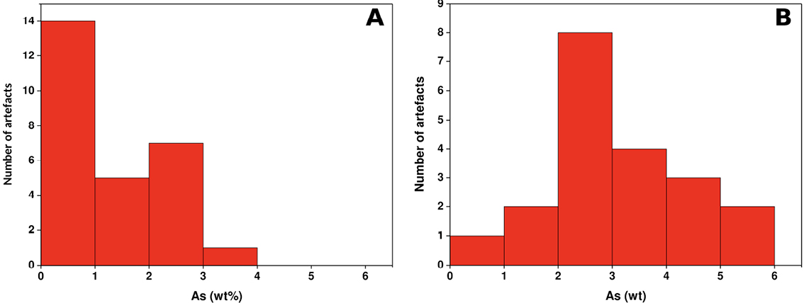 Among the metals ascribed to the Ferradeira Horizon, of particular interest is the occurrence of an awl and an arrowhead found at Bela Vista 5, a contemporary enclosure located not more than 3 km away from Herdade do Álamo. The analyses of the two artefacts were firstly obtained by EDS in SEM (Bottaini et al., 2014). More recently, in order to make data comparable, analyses were repeated by XRF, using the same equipment and methodology as used to analyse the metals from Herdade do Álamo. Despite the fact that the new data are slightly different in relation to those values published in Bottaini et al., 2014, they show an amount of As that is consistent with the values expected for “Ferradeira”, i.e. 3.05% As in the arrowhead, and 1.81% As in the awl.