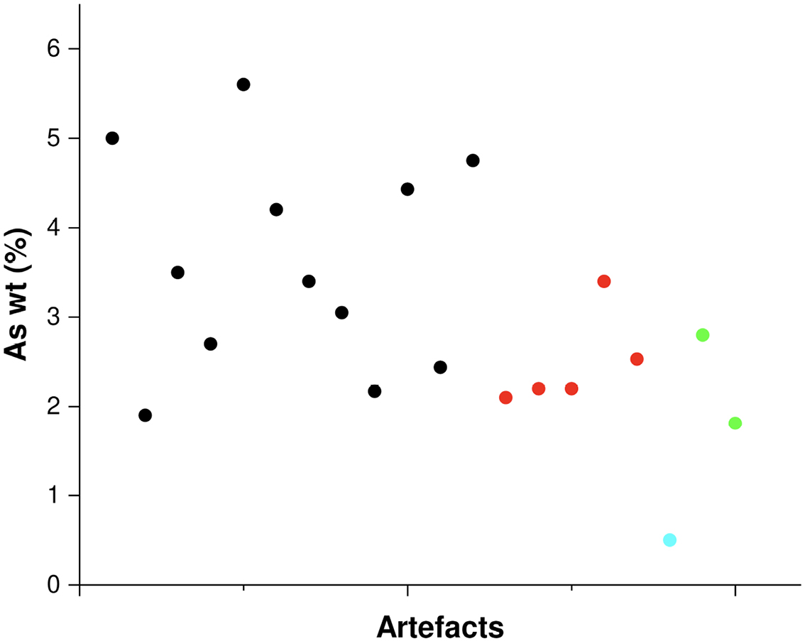 Figure 7. Plot showing the As content variability with respect to the typology of the artefacts (black dot: arrowheads; red dot: daggers; blue dot: flat axe; green dot: awls). ^