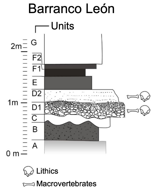 At present, 148 m2 of the BL study site have been excavated. The present research project centres on D1 and D2 l, in the southern sector of the site, an area containing an abundance of archaeo-palaeontological material. Excavation follows natural layers and all elements larger than 20 mm and smaller than 20 mm that are identifiable have been coordinated (x, y, z, orientation and slope). During the excavation campaigns from 2017 to 2020, a total of 51 of 1 m2 each one were excavated 17 m2, 15 m2, 13 m2 and 6m2 respectively.