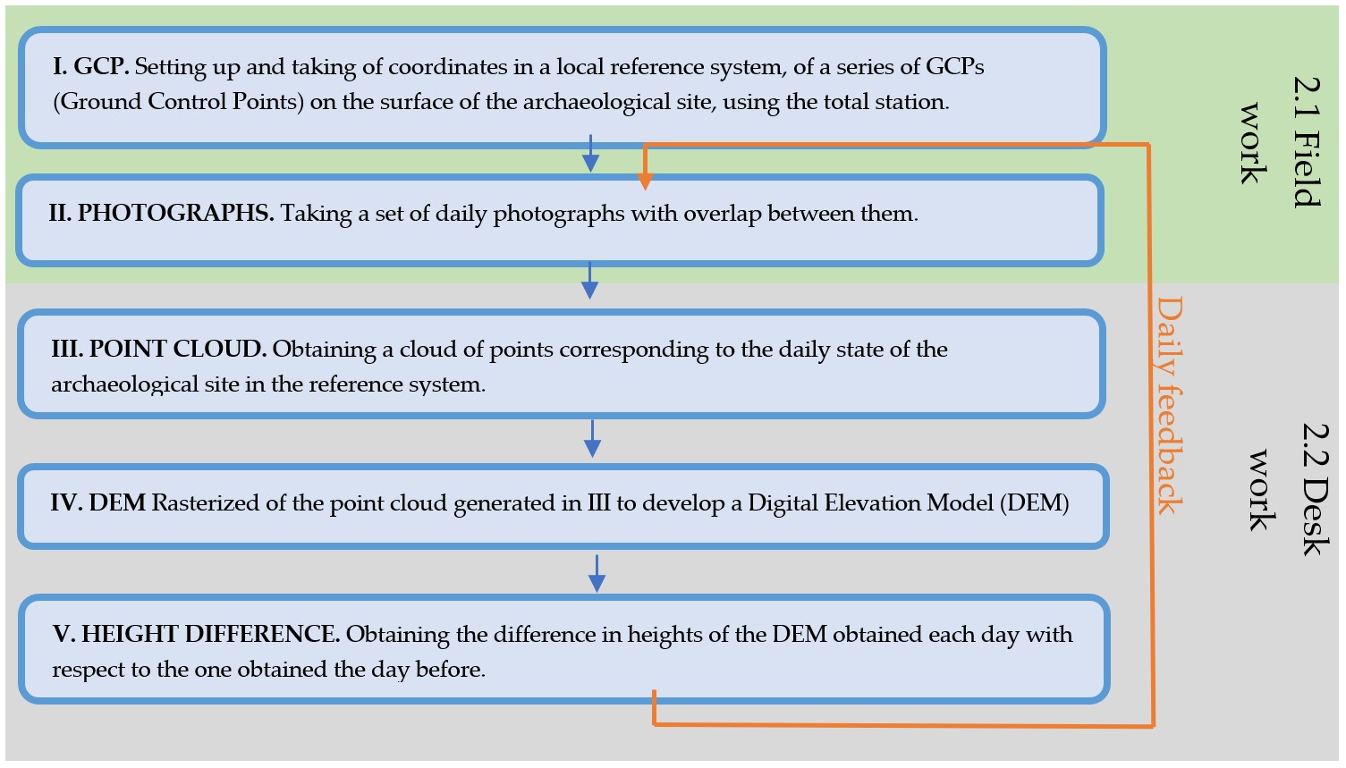 Discussing the contributions of the excavation monitoring method described in this document in relation to the current methods that use photogrammetry algorithms; Callieri et al. (2011) makes a first approach of what can be achieve using photogrammetry in an archaeological site but does not develop any DEM from the 3D models obtained; Rinaudo et al. (2012) obtains just a point cloud and a DEM from the archaeological a Roman archaeological village located in Aquileia, but does not periodically monitor the excavation in the way proposed by this method; Waagen (2019) performs periodic DEMs but does not obtain the difference of DEM since his study focuses on different issues than those raised in this paper; Martínez-Fernández et al. (2020) makes a very in-depth analysis of the excavation monitoring by means of the DEM difference and by volume differences of the 3D models obtained, but does not carry out a daily or weekly monitoring as proposed by the presented method. So, the focus of this contribution is a method for daily monitoring of an archaeological excavation so the director(s) can visualise DEM differences on a daily basis to efficiently inform any relevant fieldwork decisions.