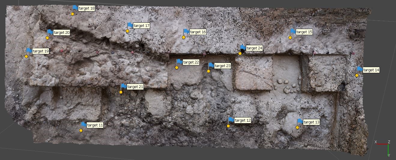 Firstly, 14 GCPs (Ground Control Points) were established at the site for the time of the excavation campaign. A number greater than 8 GCPs was chosen, this being the minimum number established by Nagendran et al. (2018), to ensure a reliable photogrammetric output. The GCPs were distributed along the edges and within the site in a stratified way (fig. 6), following Martínez-Carricondo et al. (2018). The GCPs were fixed to the terrain using nails to prevent displacement because the archaeological site is heavily frequented by staff members during excavation; each GCP had a nail in the centre of the drawn target. Then, the total station was used to establish the coordinates of the 14 GCPs in a local reference system.