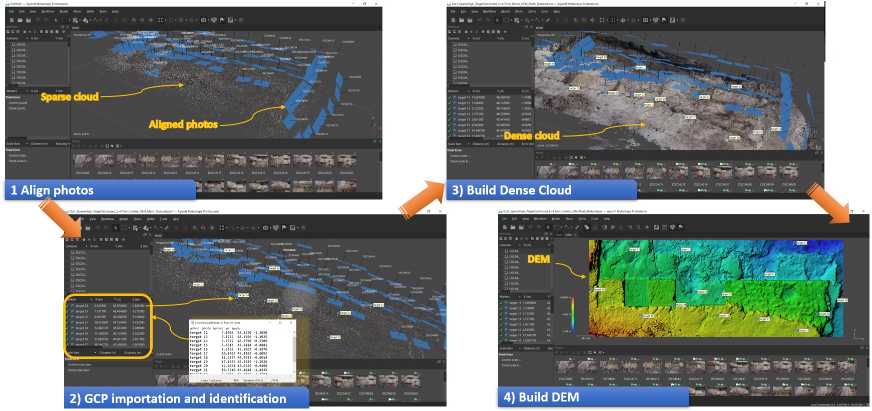 For the desk work, the following two software programs were used: Agisoft Metashape for photogrammetry and QGIS 3.14 to process the DEM raster. Thus, with each set of 130 photographs per day and the coordinates of the 14 GCPs fixed, a dense cloud of points (n = c. 18 million) was generated in the local reference system using Agisoft Metashape. The process for generating the point clouds in a local reference system entailed the following workflow (fig. 7): 1) Align photos. This process begins with the alignment of the photographs. The output of this step is to establish the relative position of all the photos with respect to a single reference photo, randomly selected by the program, and a sparse point cloud. 2) GCP importation and identification. This step involves importing the GCP coordinates from a txt file into the software and then manually identifying the GCP points present in each photograph. 3) Build a dense cloud. In this step, the software generates a dense point cloud within the GCP-defined local reference system. 4) Build the DEM. The desired Digital Elevation Model is generated, after which the level of detail of the raster can be chosen together with the spatial accuracy or the size of terrain that each pixel represents. In Agisoft Metashape the variable is called “pixel size” in the DEM menu export. In our case, all the rasters were generated with a 0.007m cell size.