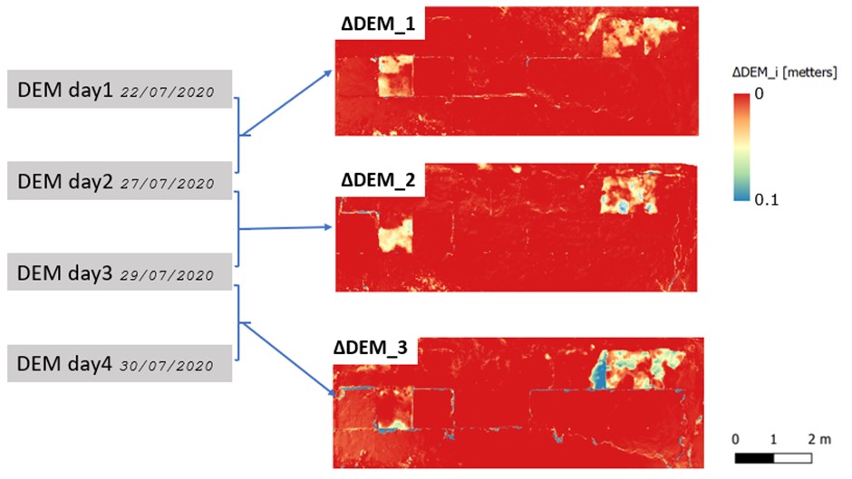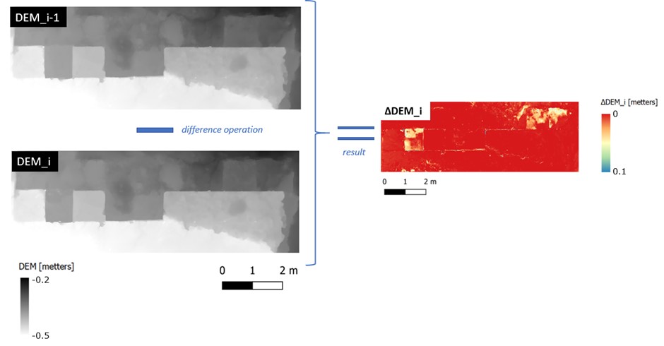 Regarding the resulting output (an elevation difference raster presented as a time series [known as ∆DEM_i]) the excavation team can georeference any relevant archaeological remains found on two successive days by filtering the desired height difference in the daily ∆DEM_i raster. This assists the excavation team to monitor the retrieval of archaeological remains, pinpointing the position where an object is found and speeding the inventory process.