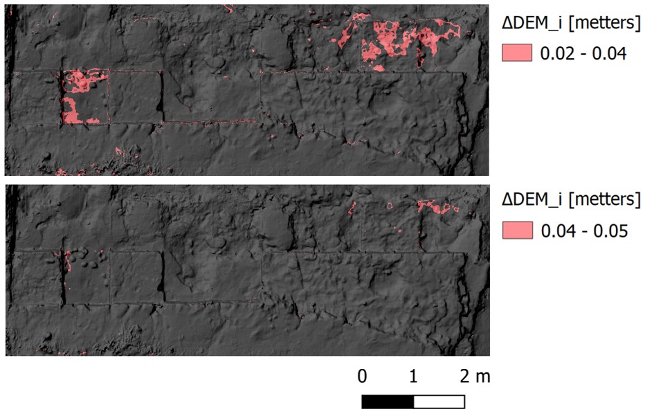 Knowing the position where archaeological remains have been found and their size on each of the axes, it is possible to filter on ∆DEM_i to highlight areas whose DEM difference corresponds to the measurement of the archaeological remains on its axis perpendicular to the ground plane. In this way, it is possible to know exactly from where they have been extracted. An example of filtering is shown in figure 10.