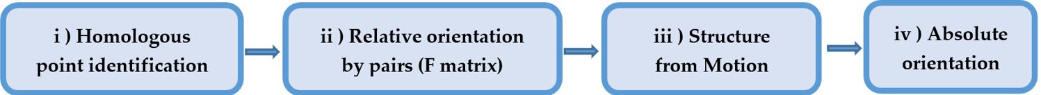 Our research focuses on the affordances of digital photogrammetry. Digital photogrammetry is based on the knowledge of the projectivity of a series of overlapping photographs to establish the three-dimensional coordinates of a real scene (Mikhail et al., 2001). Two main dimensions of digital photogrammetry are currently being applied to archaeology: 1) the Multiple View in Geometry and structure from motion approach Hartley and Zisserman (2000) and 2) the Scale-Invariant Feature Transform (SIFT) algorithm developed by Lowe (2004). Multiple View approaches the problem of relative orientation from the field of projective geometry. The concept of an outlier is used to subsequently eliminate such points using Random Sample Consensus (RANSAC) techniques (Fischler and Bolles, 1981; Hast et al., 2013; Hollander et al., 2007), and the calculation of matrices with a large number of rows (number of homologous points) is accelerated using “sparse matrix” techniques (Lourakis and Argyros, 2009). The SIFT algorithm (Lowe, 2004), on the other hand, makes it possible to automatically identify homologous points in the overlapping areas of photographs (areas common to both photographs) with a formerly unattained hit rate. Regarding the digital photogrammetry process, four main phases can be discerned (fig. 1): 1) Homologous point identification (Gaulton et al., 2015; Leutenegger et al., 2011; Lowe, 2004; Obdržálek et al., 2010; Rublee et al., 2011). 2) Relative orientation by pairs of photos. In this phase the fundamental matrix, called F, is calculated (Elnima, 2015; Heipke, 1997; Snavely et al., 2008). 3) Structure from Motion (SfM). This optimisation problem is known as bundle adjustment (Brown, 1976; Granshaw, 1980; Triggs et al., 2000). 4) Absolute orientation or georeferencing. This is carried out with a simple affine transformation or similarity, which takes the coordinates established in the SfM phase (phase iii) to ground coordinates (usually a geodetic system).