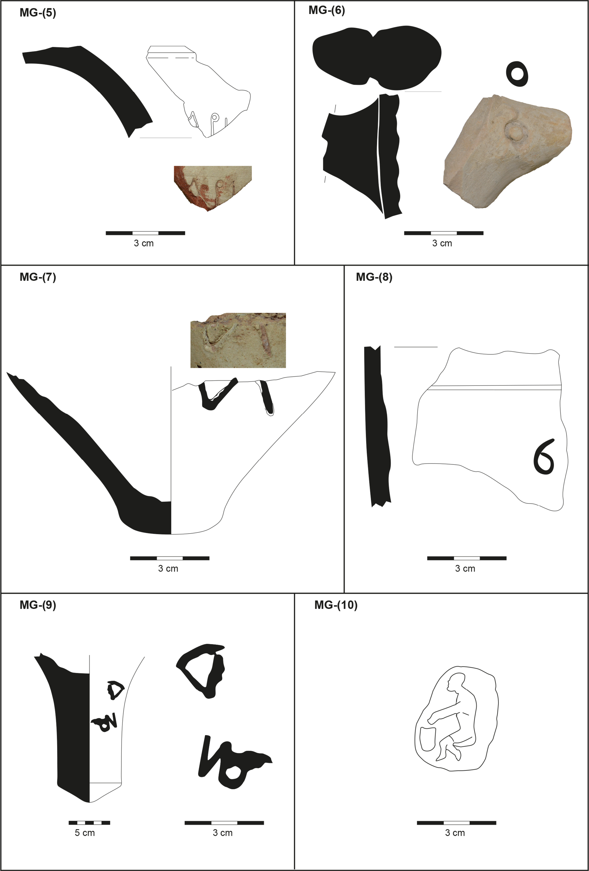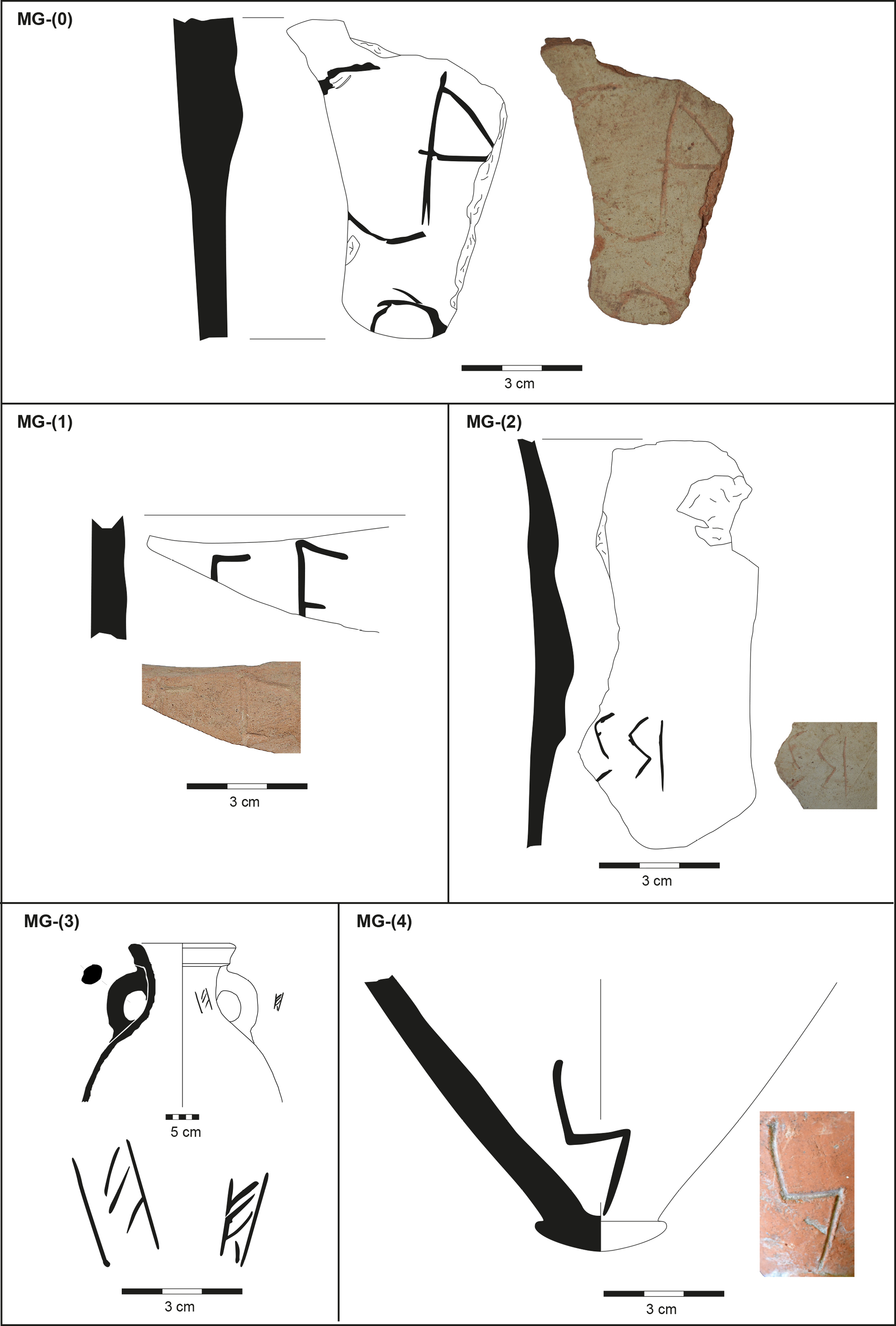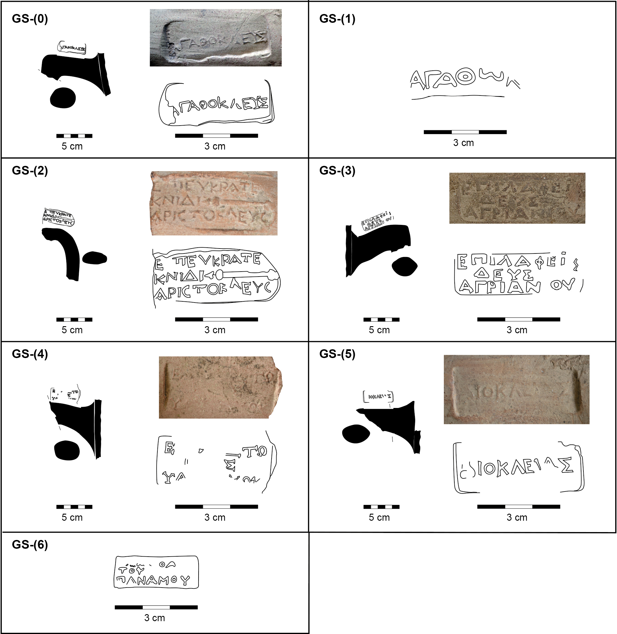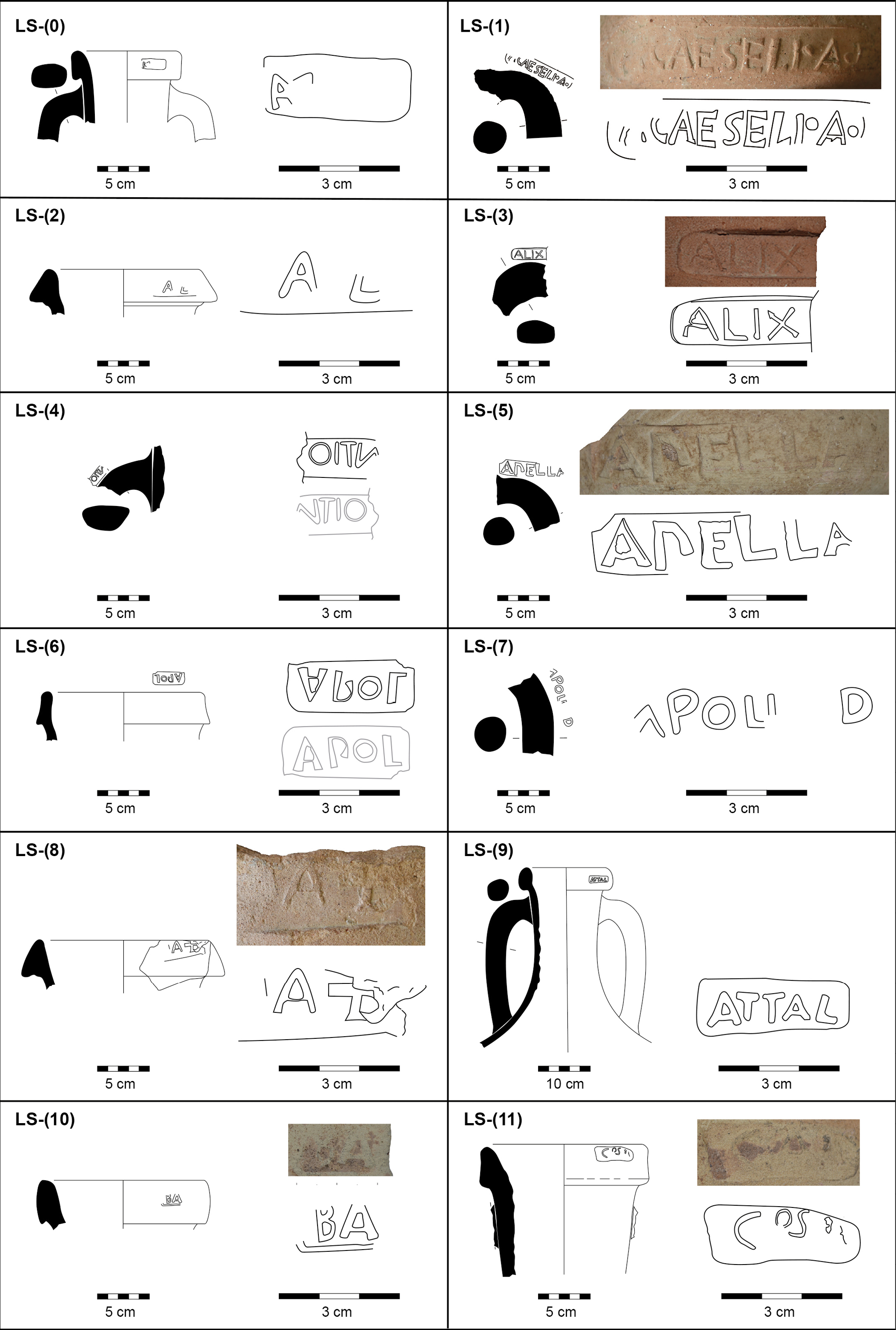 En total se han recopilado 22 sellos con epigrafía latina (LS-0 a LS-21), 7 con epigrafía griega (GS-0 a GS-6), 8 tituli picti (T-0 a T-7) y 11 marcas y grafitos (MG-0 a MG-10). Todos los dibujos, mapas, fotografías y figuras presentados en este artículo han sido realizados por el autor.