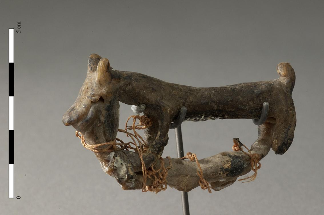 M. Haggag (2004, p. 238) suggested in her article three different explanations of the aim of this assemblage, all of them linked to the sphere of erotic and reproductive magic and perpetrated by a violent jackal: from a husband who discovers his beloved’s infidelity and kills her, also taking his own life, through the jealousy of an infertile woman who decides to reduce the reproductive capacity of another female, to a man who, having been rejected by a woman, decides to end the life of her husband and cause her infertility. Although it is tempting to interpret these objects as part of an erotic magical practice since the male figurine has an erect phallus, M.-A. Pouls Wegner (2007, p. 147) has offered an alternative scenario. In her view, this ithyphallic physiognomy could correspond to that of victims of suffocation by strangulation and hanging, probably due to the predatory behaviour of the jackal, who is attacking his neck savagely. Nevertheless, these hypotheses are difficult to verify as these objects were not recovered with a text, on either a sheet or a papyrus, that specified or alluded to the reason for their manufacture.