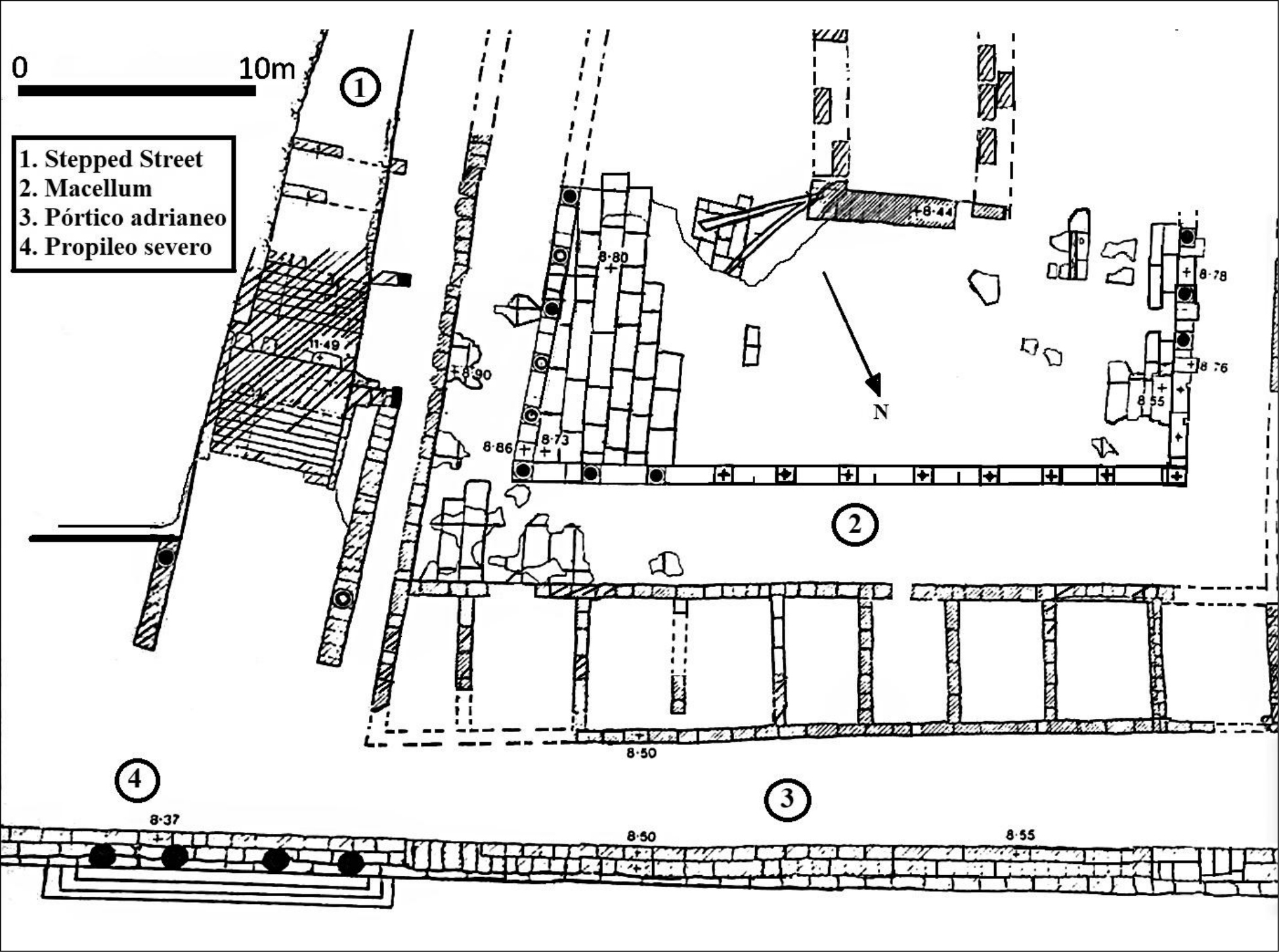 Al examinar la cuestión de los pórticos de las fachadas de los macella, conviene realizar algunas observaciones preliminares, sobre todo, con respecto a estos edificios comerciales. Si bien fueron adquiriendo progresivamente significados de fuerte carga ideológica, política y cultural a lo largo de su historia, incluso formando parte de las expresiones más eficaces del proceso de romanización, en el sentido menos impropio del término (Vitelli Casella, 2018, pp. 140-141), como un medio altamente funcional de difundir el modelo de vida urbana por todo el mundo romano (Cristilli, 2015), el macellum nunca perdió su papel fundamental como lugar comercial destinado a los ciudadanos y cuya construcción y desarrollo vinieron determinados por la ciudad correspondiente (de Ruyt, 1983; Cristilli, 1999; de Ruyt, 2000; Torrecilla Aznar, 2007; Cristilli, 2008; Andreau, 2012; Richard, 2014; Cristilli, 2015; 2018; Hoffelinck, 2020, pp. 19-20 y 22; Hoffelinck y Vermeule, 2021, p. 109). La relación que un centro urbano y su área económica establecieron con el macellum local es indispensable para su comprensión global en todos los aspectos: este vínculo, de hecho, es esencial para este edificio, incluida su propia creación, que durante mucho tiempo dependió directamente del rango cívico de la ciudad en la que se encontraba (Cristilli, 2015). También lo es su ubicación, de acuerdo con la afluencia de compradores y vendedores, de modo que permitiera no solo explotar las diferentes perspectivas visuales dentro del urban landscape, sino también satisfacer las necesidades de su pleno funcionamiento como mercado minorista de carnes y pescados (De Angelis et al., 2020). Ello, al margen de su consideración por parte de los estudiosos como indicador de la determinada situación económica de una ciudad en un momento dado de su historia (Odochiciuc, 2017). Debemos considerar que, con el tiempo, el aspecto propagandístico de adherirse al establishment (Cristilli, 2015) llegó incluso, en algunos casos, a prevalecer, como lo demuestra claramente el caso jordano de Gerasa en Arabia Petraea (Uscatescu, 2020, p. 173), quizás uno de los macella más representativos que se conocen, que se presenta como expresión de la lealtad de la comunidad local a Roma (fig. 1). Este mercado, de hecho, presenta un programa ideológico muy bien definido, ya desde su mera posición en el trazado urbano, pero es igualmente obvio que esto se logró a expensas de su función más estrictamente comercial (Cristilli, 2015, pp. 74-76 y 78-79).