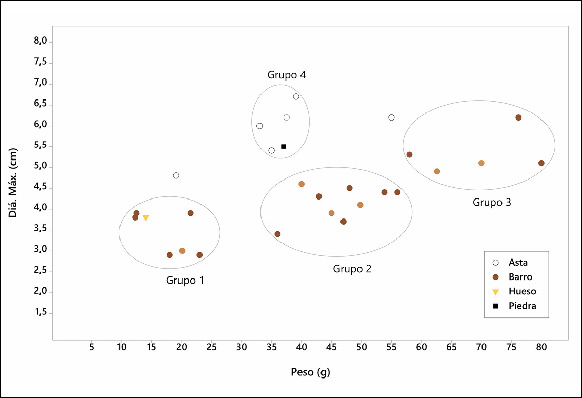 Figura 2. Gráfico de dispersión con la relación diámetro/peso de todas las fusayolas de barro diferenciadas por tipos. En colores más claros las que son representadas con su peso estimado. ^