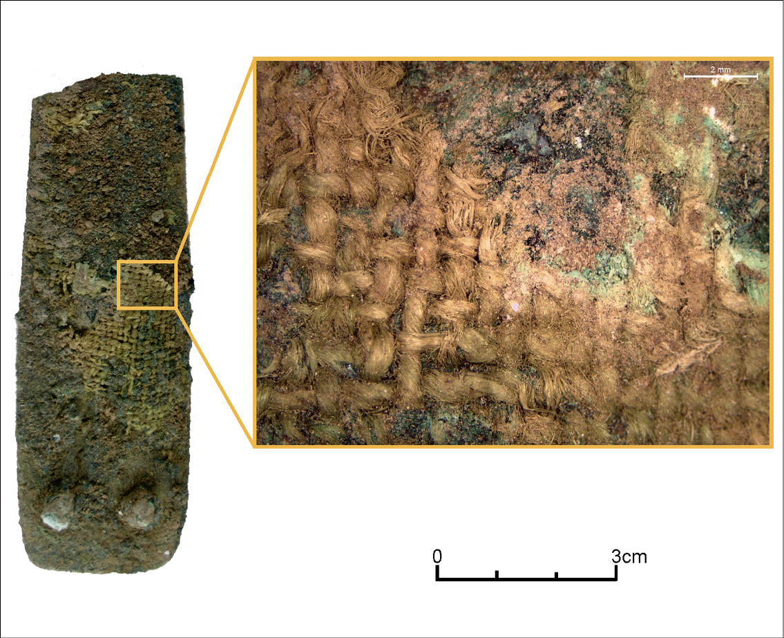 Figura 10. Puñal de bronce con tejido de lino adherido. ^