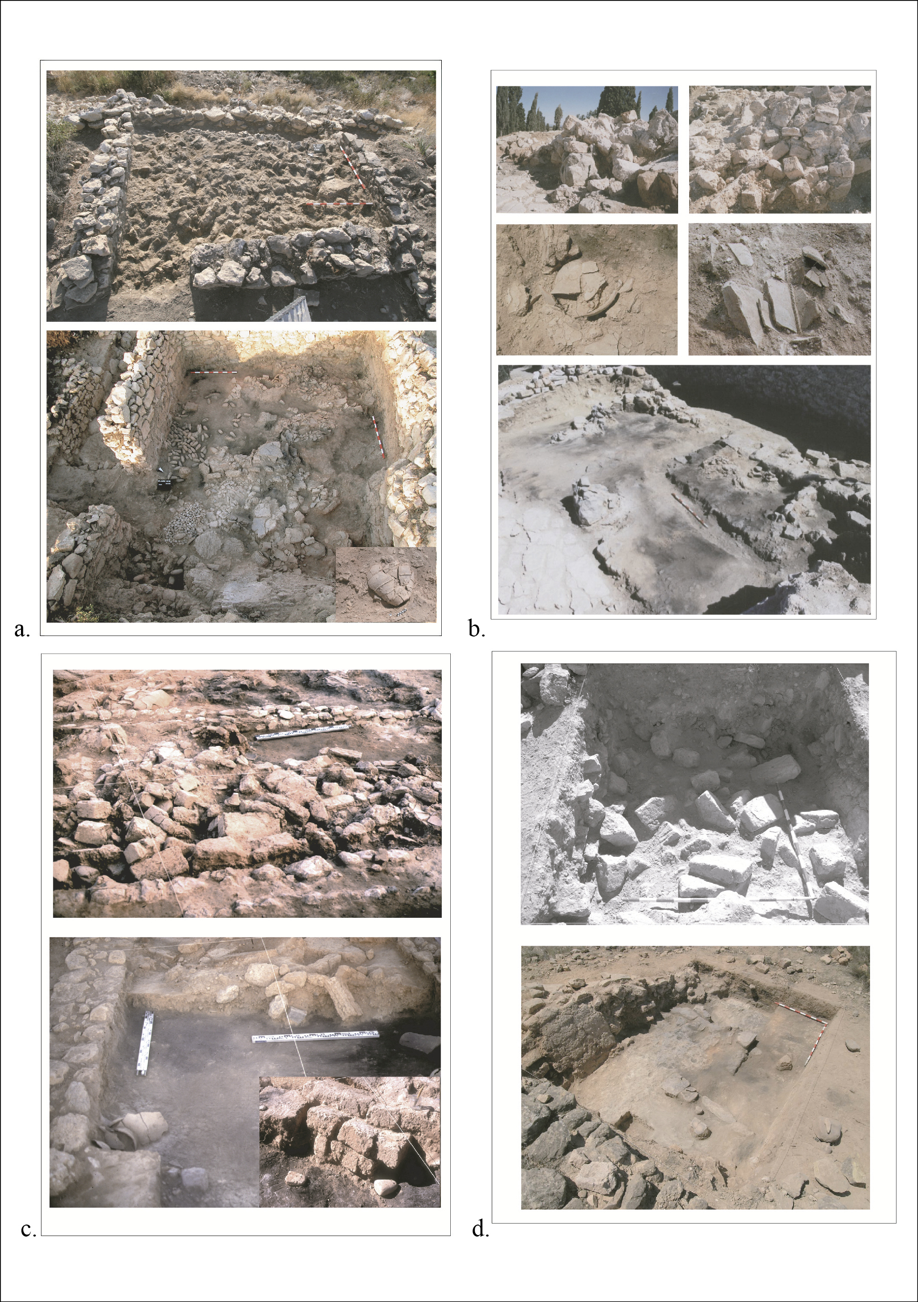Figura 2. Fotografías de los niveles de derrumbe y abandono por motivo de incendio documentados en diferentes asentamientos del bajo valle del Ebro. A) Sant Jaume (Alcanar) (imágenes cedidas por David Garcia i Rubert); B) Turó del Calvari (Vilalba dels Arcs) (Archivo GRESEPIA-URV); C) Barranc de Gàfols (Ginestar) (imágenes cedidas por Carme Belarte Franco); D) San Cristóbal (Mazaleón) (imágenes cedidas por Luis Fatás Fernández). ^