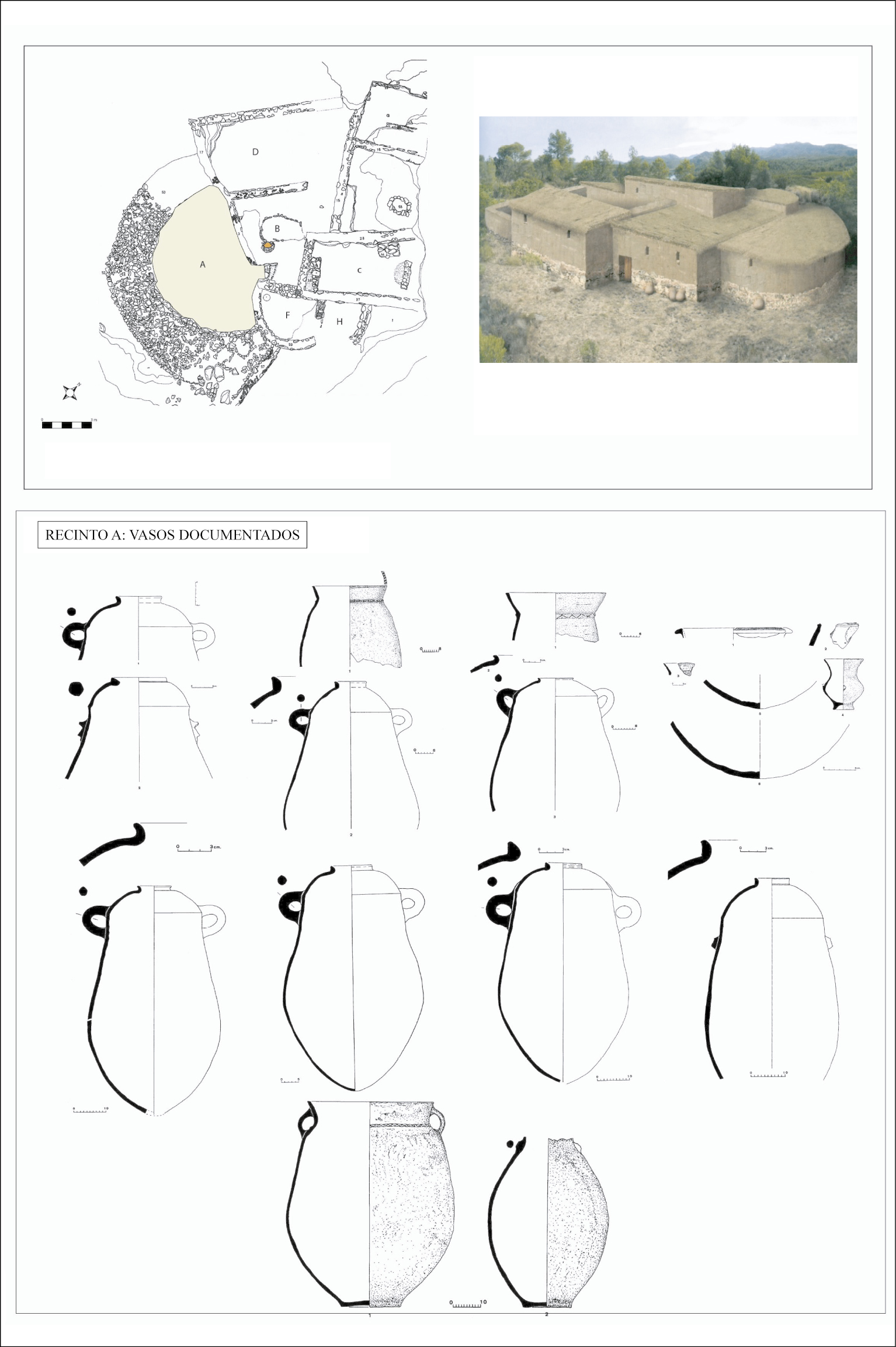 Figura 3. Planta del asentamiento de Aldovesta (Benifallet) con el conjunto de recipientes documentados in situ en el denominado recinto A (elaboración propia). Recreación hipotética del recinto por M. H. Pongiluppi (parte superior derecha). ^