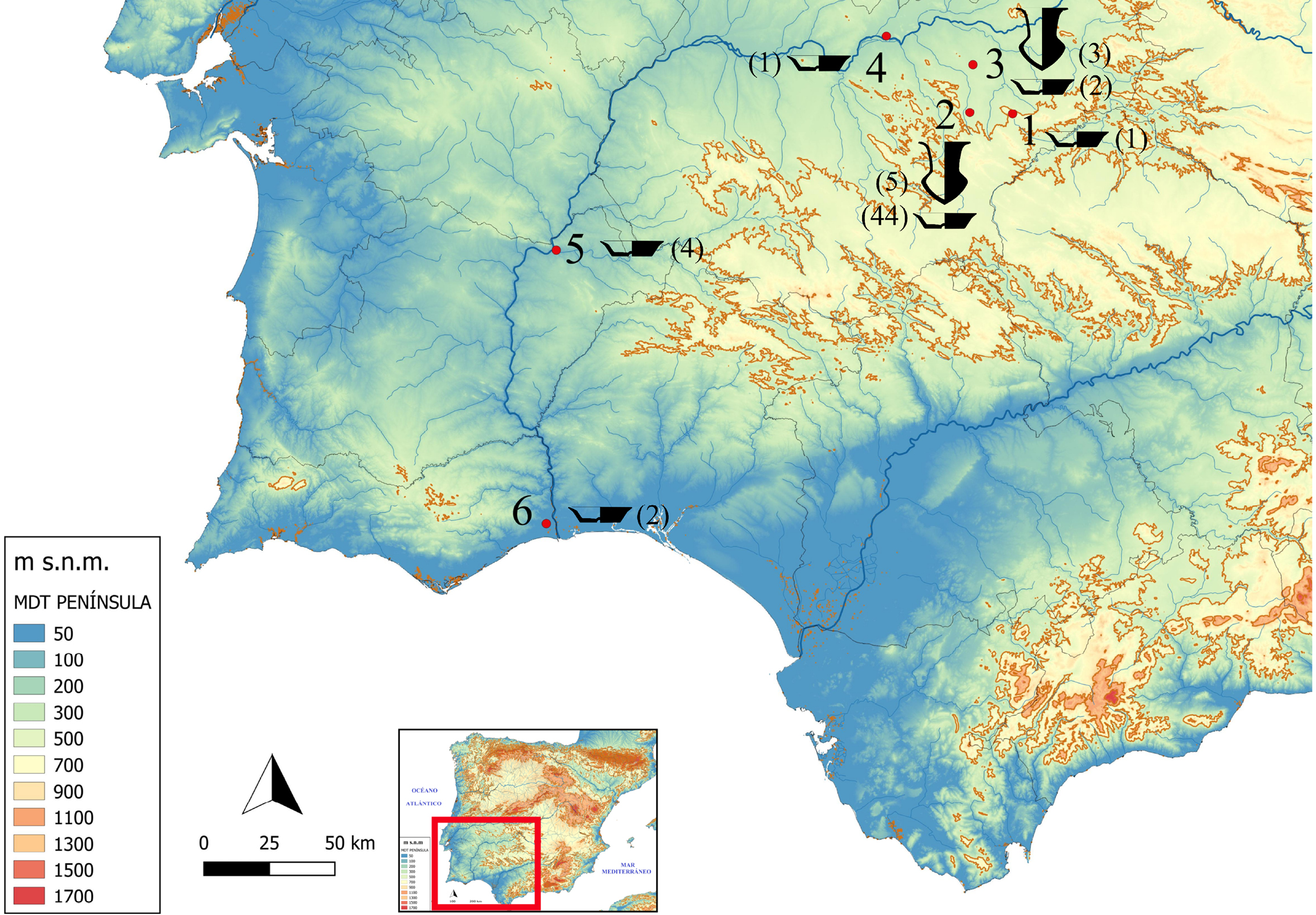 Figura 1. Mapa del suroeste de la península ibérica con los yacimientos en los que se han documentado vasos margarita y capeliformes (se indica el NMI en cada caso): 1. Castillejos del Helechar (Benquerencia de La Serena, Badajoz); 2. Cancho Roano (Zalamea de La Serena, Badajoz); 3. La Mata (Campanario, Badajoz); 4. Casas del Turuñuelo (Guareña, Badajoz); 5. Azougada (Moura, Alentejo); 6. Catro Marim (Faro, Algarve). ^