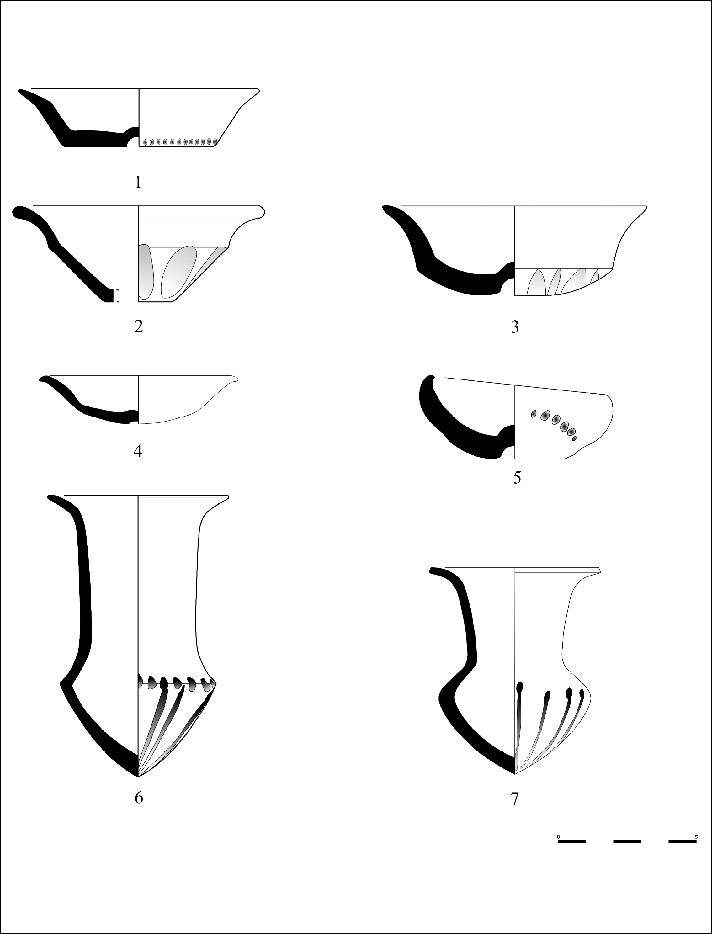 Figura 2. Tipología de los vasitos margarita. Tipo 1: 1. Tipo 2: 2-3. Tipo 3: 4. Tipo 4: 5. Tipología de los vasos capeliformes: 6-7. ^