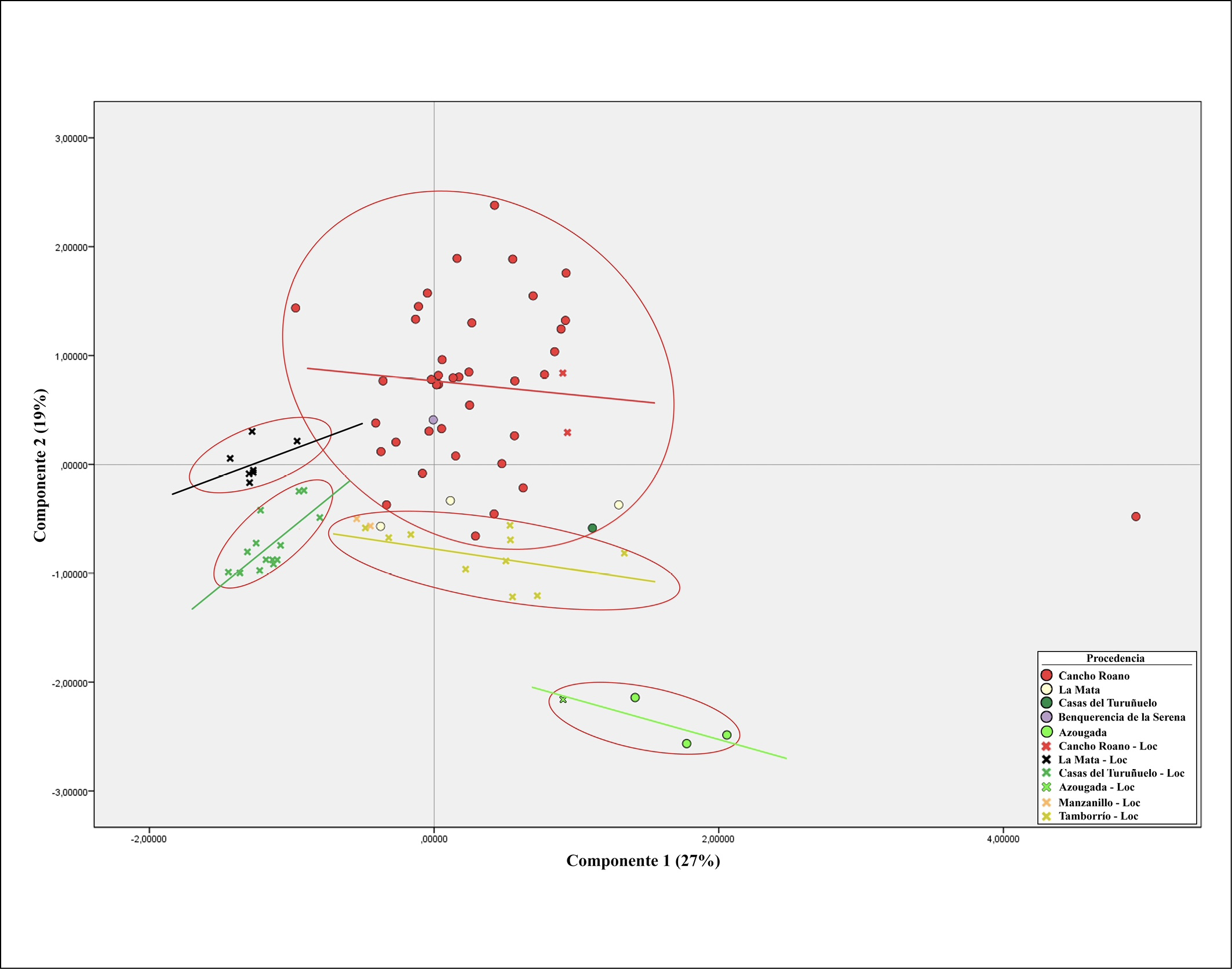 El total de muestras analizadas asciende a 48 vasos margarita y capeliformes, procedentes de los sitios de Cancho Roano (n=39) —que representa el mayor conjunto—, Azougada (n=4) —una de las cuales es un vaso de clara factura local—, La Mata (n=3), Castillejos del Helechar (n=1) y Casas del Turuñuelo (n=1). Estas muestras han sido comparadas con los datos disponibles para otros conjuntos adscritos a varios yacimientos del Guadiana Medio ya presentados en trabajos anteriores (Rodríguez González et al., 2021). Todos estos datos obtenidos del proceso de cuantificación fueron sometidos a un proceso estadístico de reducción de dimensiones mediante el Análisis de Componentes Principales (ACP) y posteriormente comparados a través de un dendrograma con enlace intergrupo, como corroboración (Aitchison, 1983; Aitchison 1984; Whallon, 1990; Glasckoc, 1992; Baxter, 1994; Baxter 2003; Padilla et al., 2006).