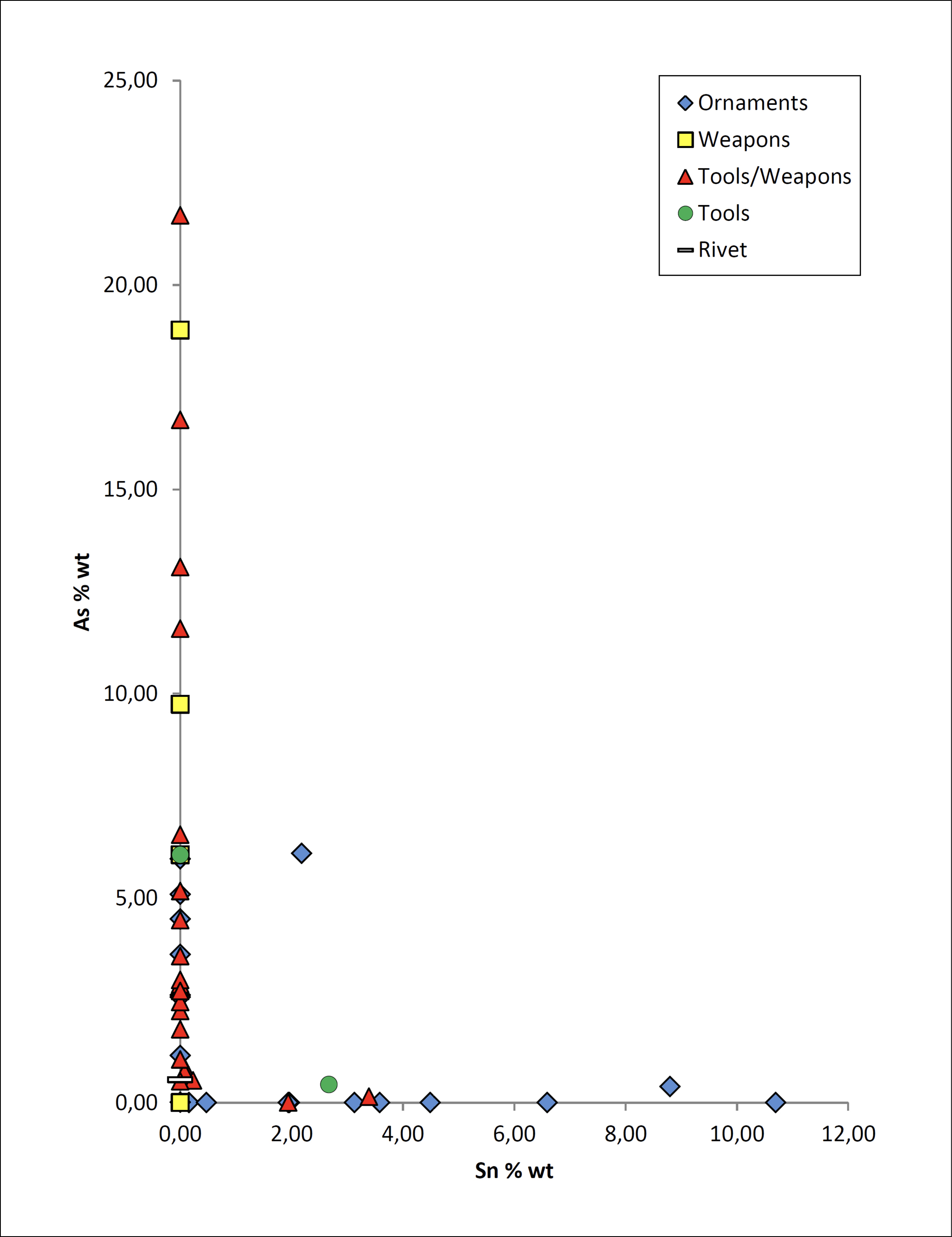 Moreover, some of the bronzes without arsenic, such as those from T62 at El Oficio or the spiral from T51 at El Argar, are placed in the distribution of minerals from the northeastern Iberian Peninsula (the Catalan coastal mountain ranges and the Pyrenees) (fig. 11). A detailed study of these early tin bronzes was developed in Montero-Ruiz y Murillo-Barroso (2022). For the time being, we can neither link to data from the Iberian Peninsula the values of the halberd from T62 at El Oficio, nor those of the dagger from T703 at El Argar.