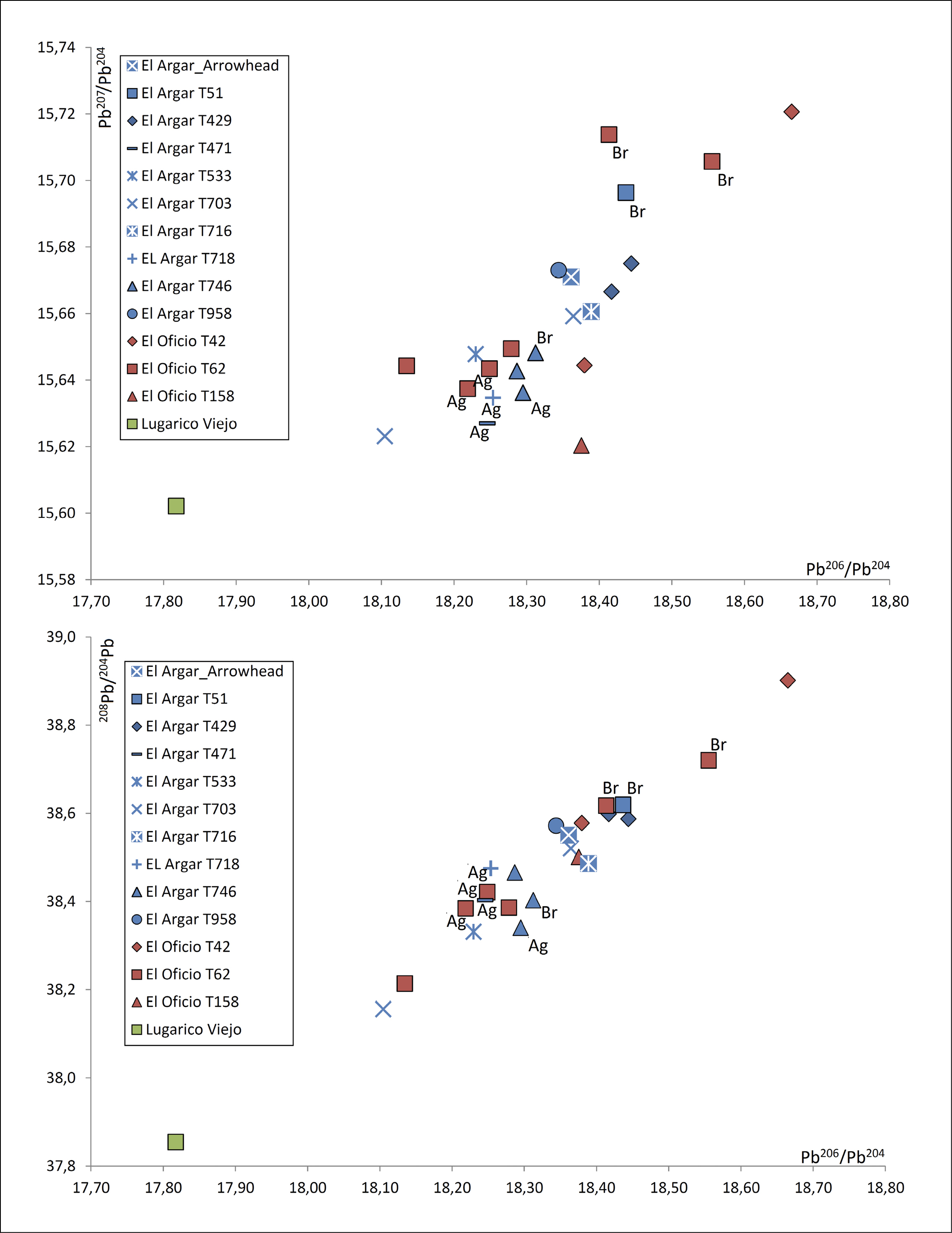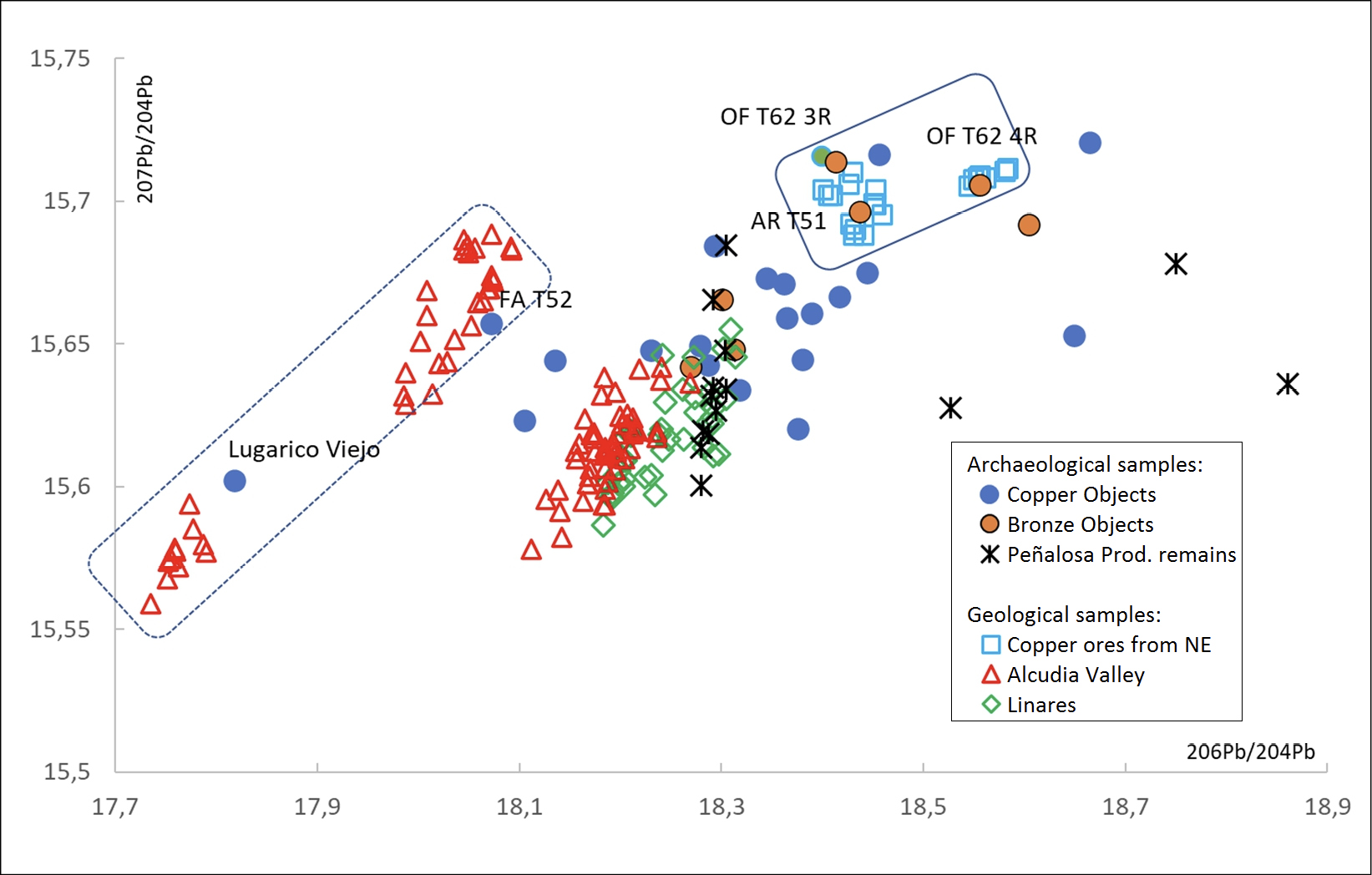 Finally, we would like to comment on the items that show values lower than 18.15 (206Pb/204Pb). Those metals are associated with older mineralisations (>400 ma), including the Alcudia Valley, an area that could justify the origin of both the axe from Lugarico Viejo and the dagger in T52 at Fuente Álamo (fig. 11).