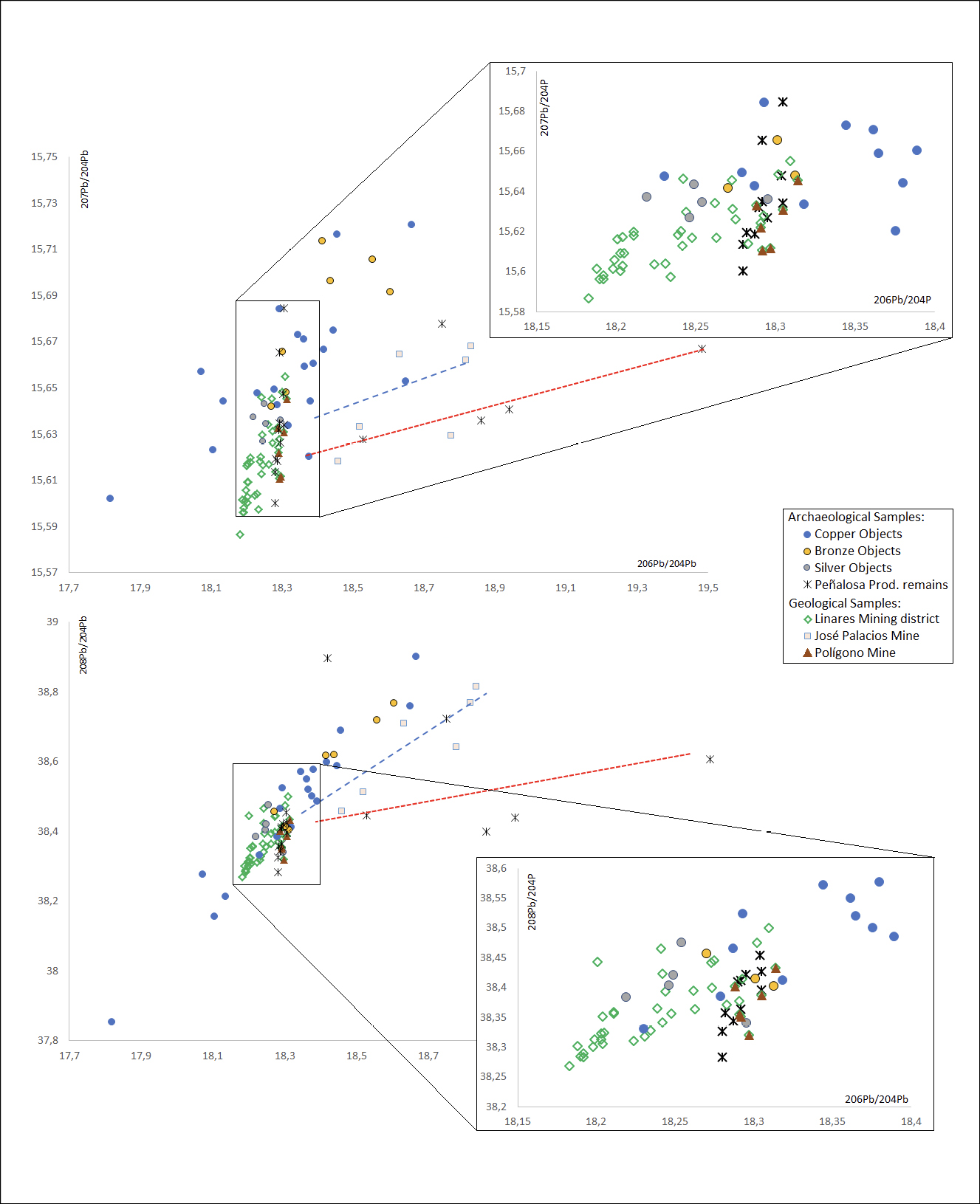 Peñalosa shows two clear tendencies (fig. 6). On the one hand, a group of samples align vertically in fig. 6a with similar values on the Pb206/Pb204 ratio but changing in the Pb207/Pb204. The samples from Peñalosa are distributed only in a limited zone of the whole isotopic field of the district of Linares, and match with the Polígono mine samples. The second trend covers the distribution towards the right of the graph with radiogenic values that exceed of 19 in the 206Pb/204Pb ratio and reach as high as 22.8 (off the graph). These results are not clearly linked with the copper ores from the José Martín Palacios mine, for whose exploitation we have archaeological proofs and radiocarbon dates (2205-2030 cal BC) (Arboledas et al., 2015), with an earlier chronology than the main Bronze Age phases of Peñalosa. This second group of ores found in the settlement show at least a second copper resource but with a completely different isotopic signature than the Linares and other close mining districts in the Central Iberian Zone, such as Alcudia Valley or Pedroches. The data from José Martín Palacios and Polígono mines, and from the unknown resource could demarcate a mixing area if metal from both types of minerals were mixed. However, no object is clearly located in this mixing region.