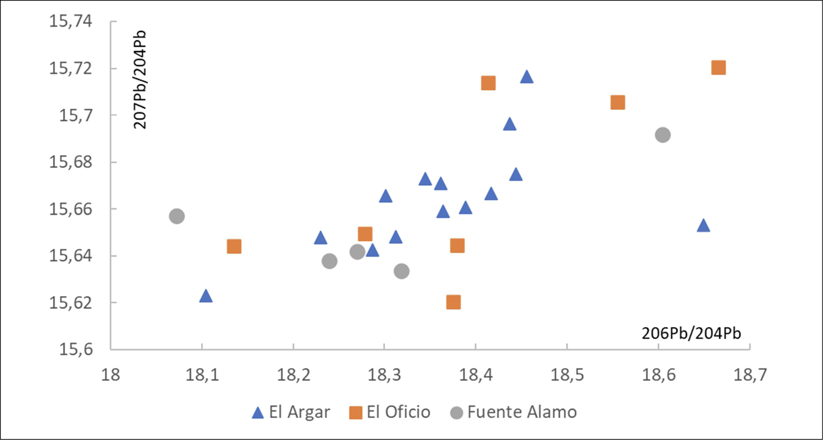 Figure 9. Lead isotope ratios of objects at El Argar, El Oficio and Fuente Álamo. Note the different tendencies in the three of them. ^