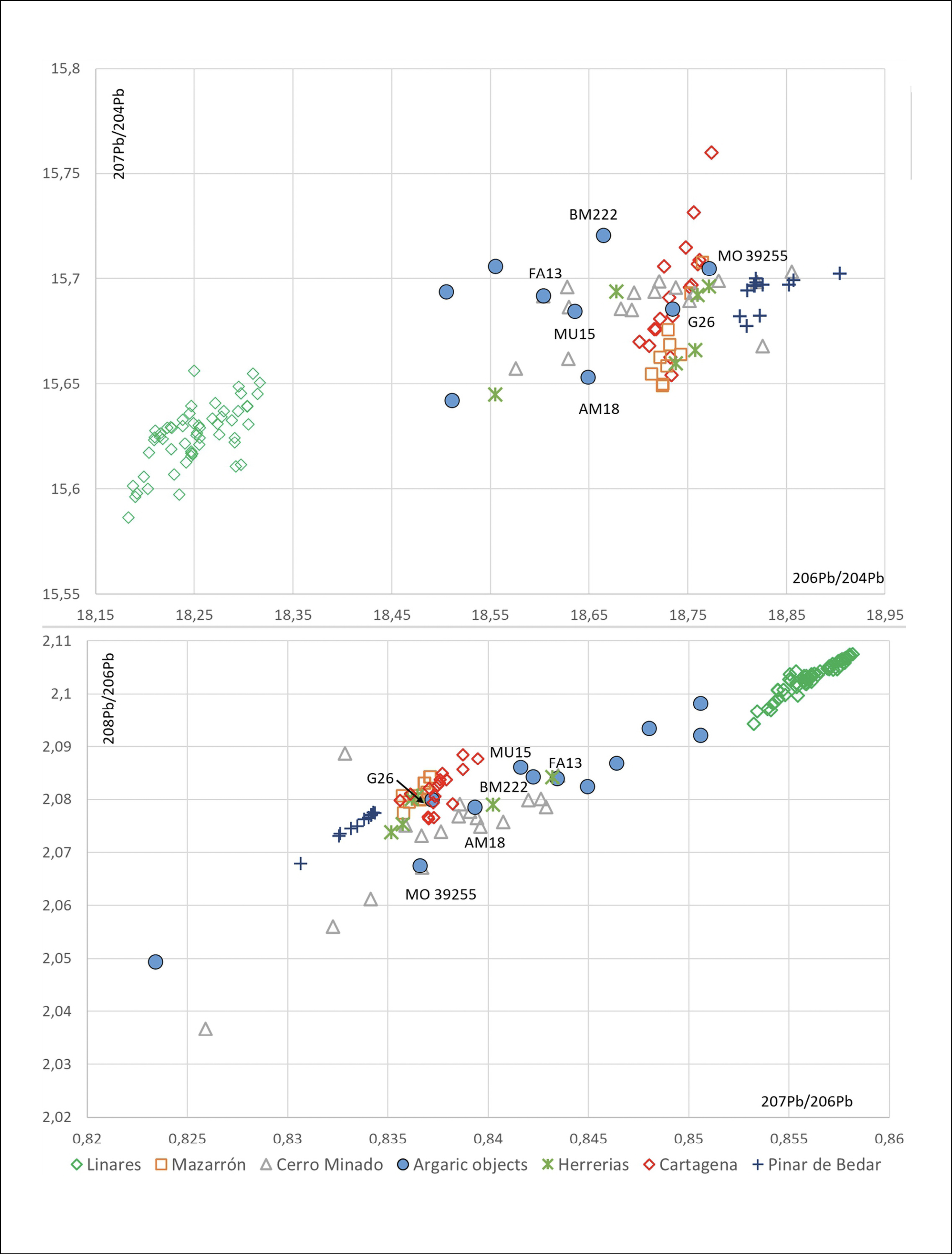 Figure 10. Lead isotope ratios of Argaric objects with an isotopic concordance with Cerro Minado mining district. ^