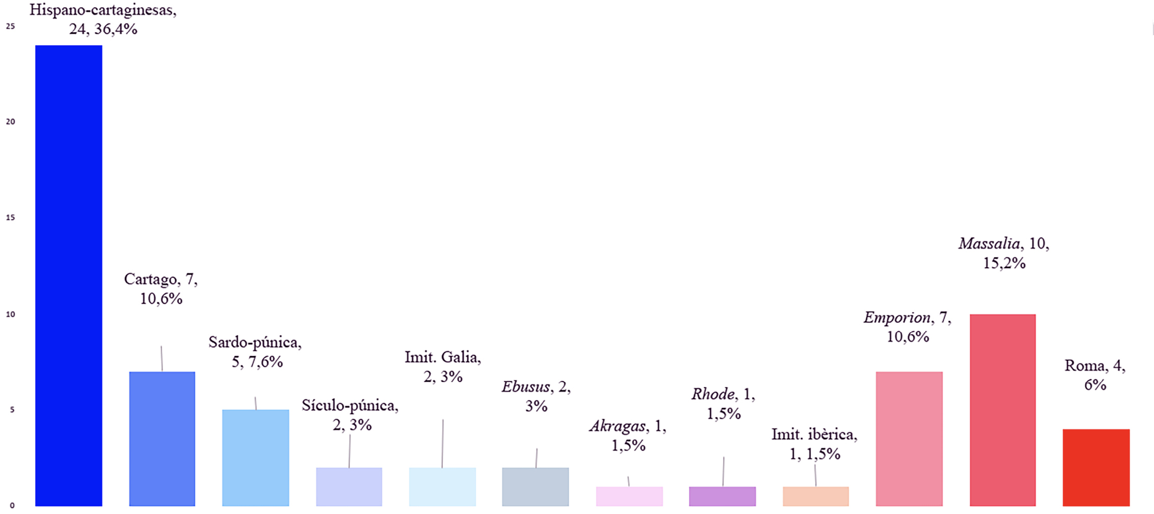 Este numerario presenta unas características muy específicas que determinan su interés. En primer lugar, a pesar de que sus cecas todavía permanecen indeterminadas y las diferentes emisiones aún no han sido bien datadas (Villaronga, 1973; Ripollès, 2022a), no cabe duda de que fueron acuñadas en la península ibérica entre el 237 a.C., momento de la llegada de Amílcar Barca, y el fin de la presencia púnica en Iberia en el 206 a.C. En segundo lugar, el hallazgo de concentraciones significativas de estas monedas al norte del río Ebro sólo puede ser explicado por la presencia de tropas cartaginesas, de aliados o de mercenarios a sueldo, en un período breve y muy preciso, en concreto entre el paso del río Ebro por Aníbal en la primavera del 218 a.C., y la derrota de las tropas comandadas por Hannón en el verano del mismo año (Noguera et al., 2020, pp. 43-51). En función de la localización de estas monedas en el nordeste peninsular podemos destacar tres zonas (fig. 1).