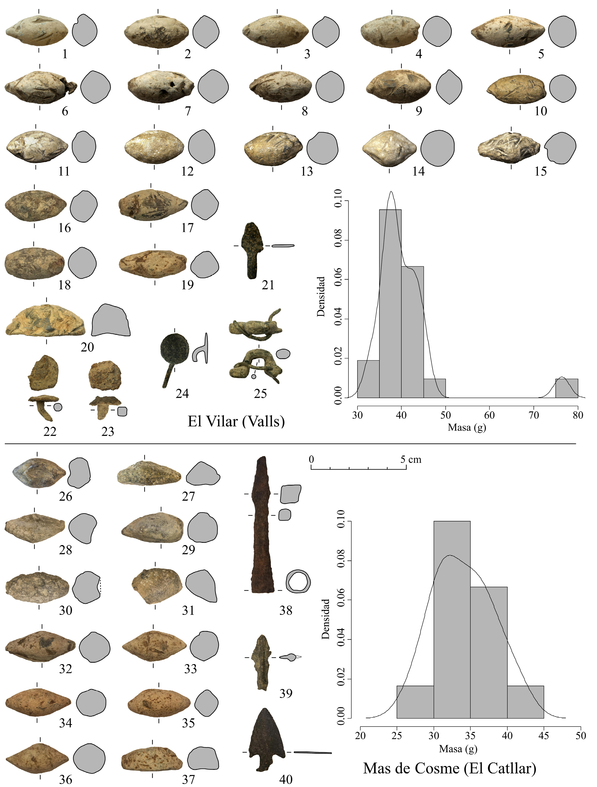 Figura 8. Selección de militaria y gráficas de masa de las glandes localizadas en El Vilar (Valls) y Mas de Cosme (El Catllar). ^