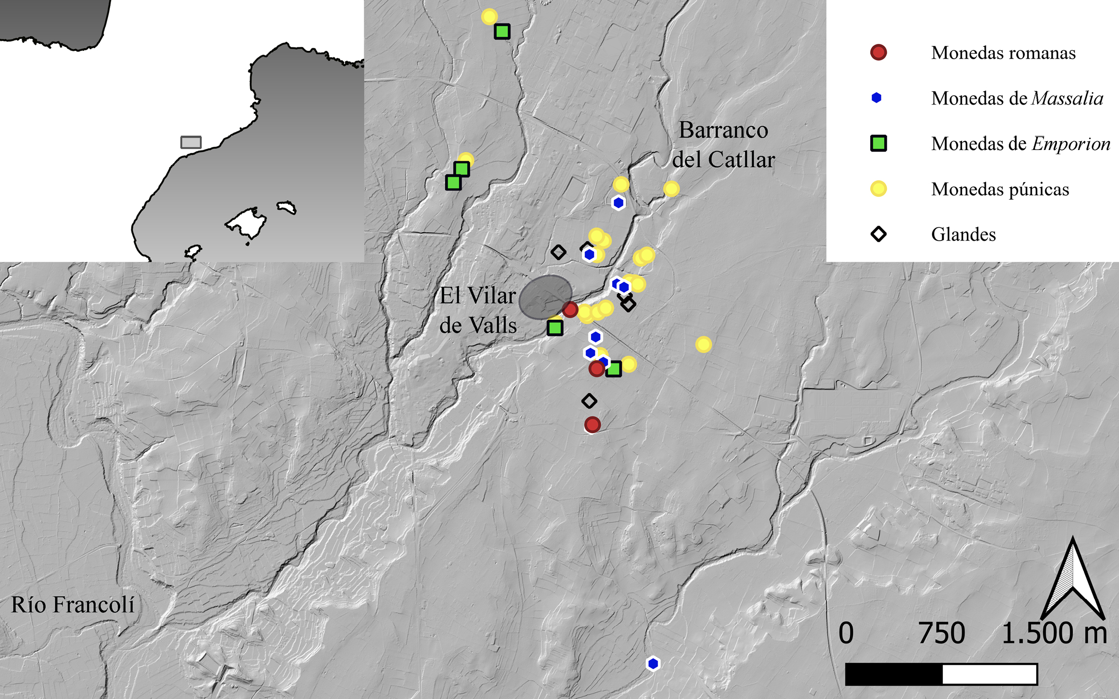 Desde el punto de vista cronológico, es evidente que la gran mayoría de estas monedas se perdieron o amortizaron durante el año 218 a.C., único momento en que el ejército cartaginés tuvo una presencia y un control efectivos de parte del territorio al norte del río Ebro. Y desde el punto de vista geográfico, su localización presenta dos patrones de distribución concéntricos, con una estructura radial. Una primera corona se sitúa alrededor de la ciudad cosetana de El Vilar, donde se concentra la mayoría de las piezas, con una distribución preferente en el norte, pero especialmente en el este, al otro lado del barranco del Catllar (fig. 9).
