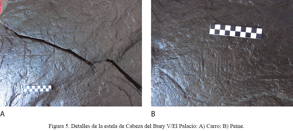 Cinco son los objetos de prestigio que podemos observar en la estela de Cabeza del Buey V/El Palacio: dos espejos, la fíbula, el carro y el peine. Se trata de algunos de los elementos adicionales que –salvo el carro– a veces aparecen junto a las armas en las estelas de formato básico (en ese orden de frecuencia cuantitativa) (Celestino 2001: 164-165, 167 y 195); pero que más habitualmente se integran en las composiciones donde está presente el antropomorfo. Restringiéndonos al subgrupo de los guerreros sin tocado y con espada al cinto, los cuatro elementos asociados solo están presentes en la estela de Cabeza del Buey II/La Yuntilla Alta; en tanto los demás ejemplares conocidos presentan abundantemente espejos, en menor medida carros, ocasionalmente peines y solo puntualmente fíbulas, aunque en el caso de este último objeto no siempre resulta clara y aceptada su identificación.
