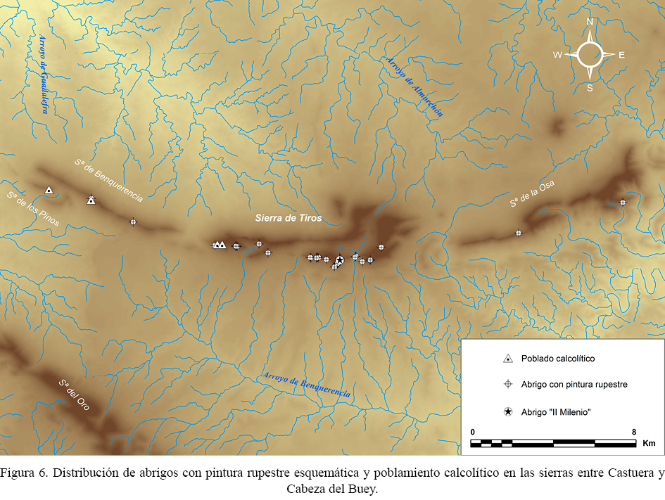 Las manifestaciones pictóricas rupestres de Helechal forman parte del conjunto de abrigos pintados extremeños que se extienden, de suroeste a nordeste, entre las sierras de Castuera y la Moraleja, y se integran de una forma más amplia en el importante y personalizado núcleo de La Serena, con más de un centenar de enclaves catalogados (Martínez Perelló 1999). No obstante, sus dinámicas generales de evolución temática, técnica y tipológica entroncan con las generalmente observadas en el arte rupestre postpaleolítico regional (Collado y García 2010 y 2013; Collado et al. 2014). Restringiéndonos al espacio serrano entre Castuera y Cabeza del Buey (fig. 6), se han documentado hasta el momento unos 36 enclaves de tipología muy variada (grandes oquedades, abrigos de escasa profundidad, estrechas grietas entre farallones verticales, etc.) que en su mayor parte albergan paneles claramente orientados hacia el espectador, dispuesto a una altura media de un metro desde el nivel del suelo actual de los abrigos, y ocupando superficies de muy diversos tamaños. En ellos, por regla general, no se advierten elementos escenográficos o criterios compositivos claros, sino una reiterada yuxtaposición de motivos diversos sobre las superficies seleccionadas, cuyo uso gráfico varía desde paneles con un escaso aprovechamiento pictórico de la superficie disponible hasta auténticos palimpsestos densamente poblados de motivos superpuestos, de gran interés para determinar su evolución diacrónica.