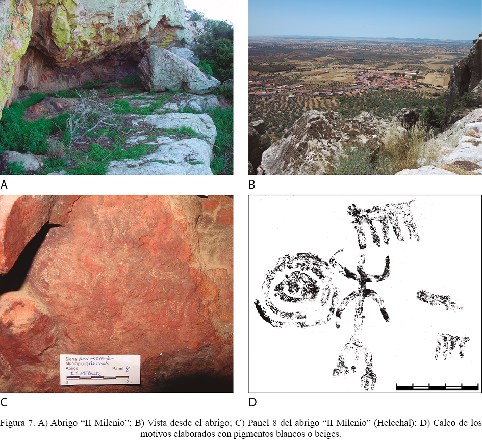 Ambas figuras, antropomorfo y escudo, que están plasmadas haciendo uso de los pigmentos blancos o beiges antes mencionados, parecen estar acompañadas de otras en esos mismos tonos: un pectiniforme situado sobre ellos y algunos restos más de difícil interpretación en la parte inferior del panel. Más allá de ello, las representaciones del abrigo “II Milenio” poseen además dos singularidades: la primera, que permite ampliar el registro de soportes fijos con motivos vinculados al mundo de las estelas (Collado 2016: 9-10) –que se suman a los grabados ya conocidos en La Serena (Domínguez y Aldecoa 2007), Espejo (Córdoba) (Murillo et al. 2005: 22), con más dudas Logrosán (Cáceres) (Rodríguez et al. 2015), y a algunos otros enclaves del Tajo portugués (Gomes 1989: figs. 21 y 24; Brandherm 2007: 25)–; la segunda, su ubicación en los límites del poblado posiblemente más representativo, como veremos a continuación, de la Sierra de Tiros.