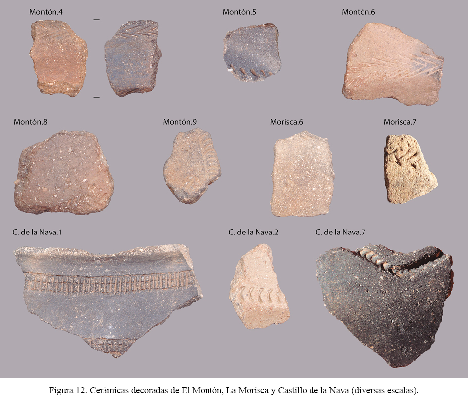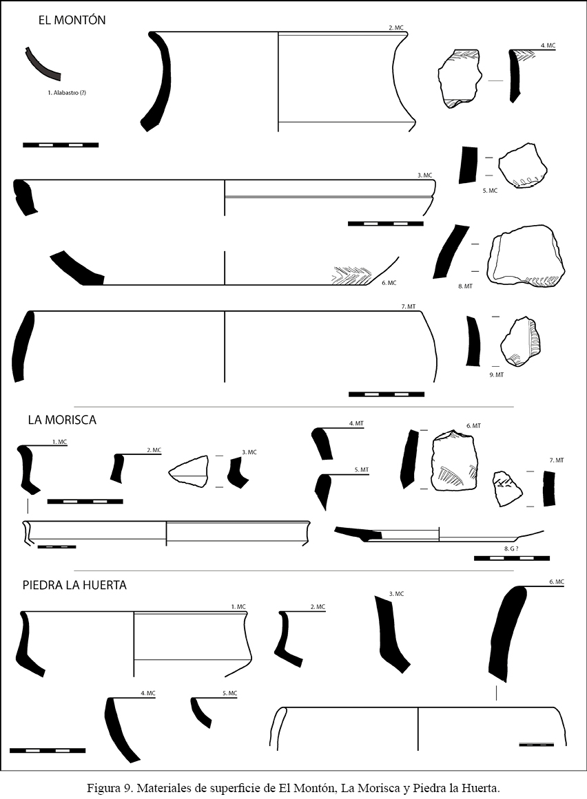Idéntica adscripción crono-cultural podría proponerse, en base al material de superficie, para el asentamiento de La Morisca (fig. 8, C). Estamos, en este caso, ante una ocupación a media ladera (en torno a unos 700 m s.n.m.), de dimensiones más limitadas, en torno a 0,7 ha. No es descartable, en cualquier caso, que fuera algo mayor, en tanto nos consta la recuperación de material más al oeste. Como en las ocupaciones anteriores, procedentes de aquí se conocen fuentes troncocónicas de carena alta, borde vertical y labio indicado, asimilables a las conocidas manifestaciones de Cogotas I, así como fragmentos decorados con impresiones e incisiones que remiten a casos similares de los horizontes proto– y cogoteño en la Baja Extremadura y Andalucía Centro-Occidental ya aludidos (fig. 12). No es descartable, en todo caso, que el asentamiento perviviera algo más, dada la recogida de posibles fragmentos de cerámica gris en sus superficies (fig. 9). También en esta ocasión estamos ante un poblado con gran dominio visual que, situado frente al Montón, se proyecta sobre todo al sudeste, al gran valle de conexión con Córdoba.
