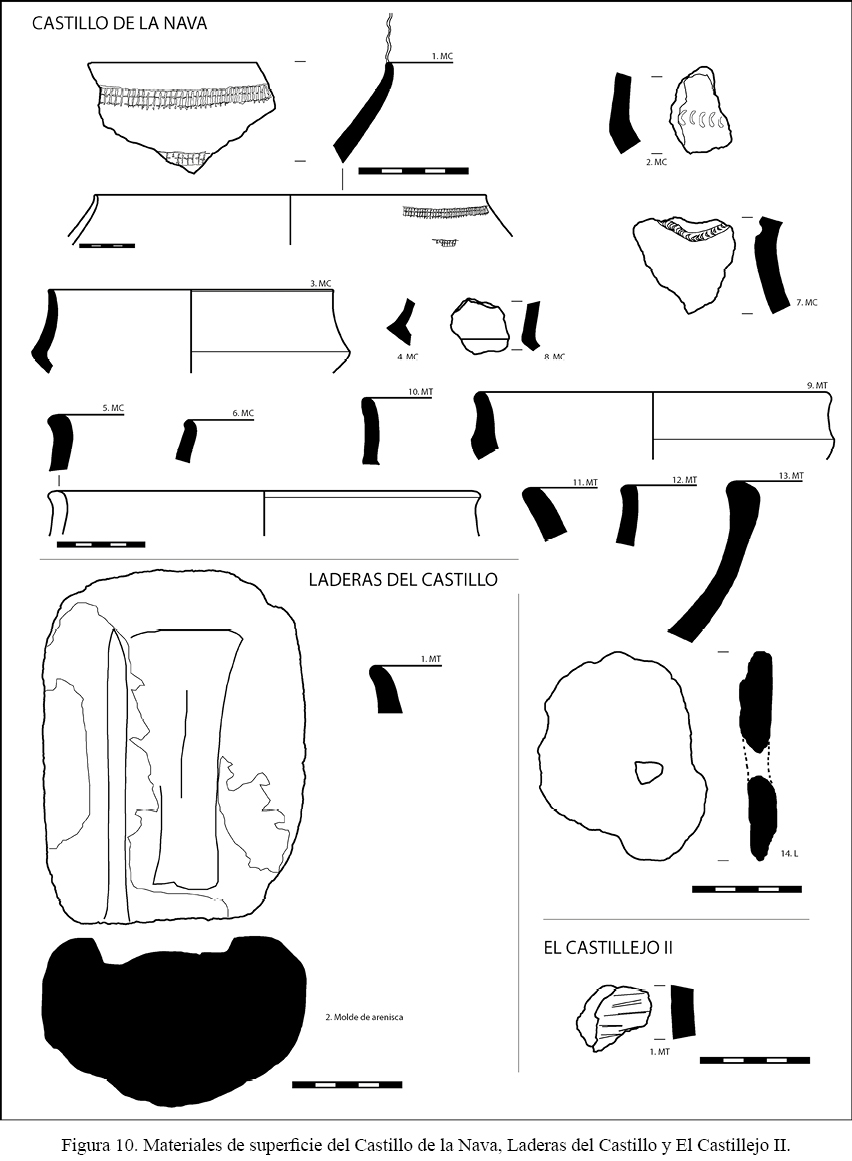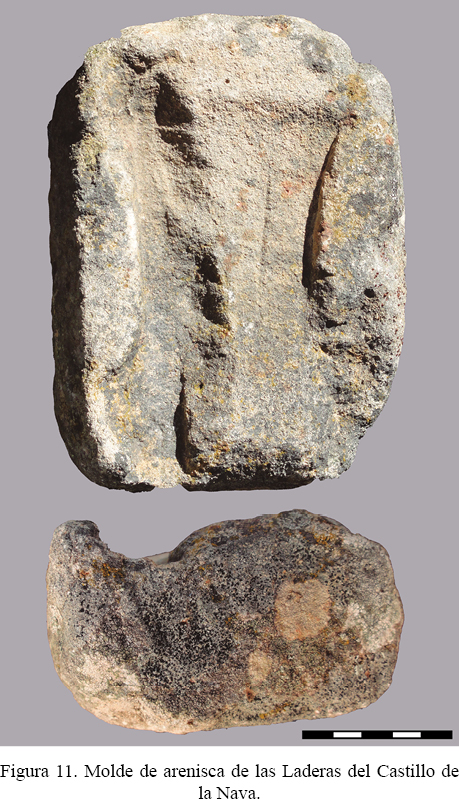 Otro asentamiento representativo de la Edad del Bronce –aunque no puede descartarse una ocupación anterior, acaso calcolítica– es el del Castillo de la Nava (fig. 8, B). Se trata de una ocupación en ladera, posiblemente facilitada por estructuras de acondicionamiento en terrazas que ocasionalmente se intuyen en la topografía del sitio, que también alcanza a la cima, muy modificada por la posterior ocupación islámica. Su altitud es de en torno a 835 m s.n.m. y la extensión total que permiten calcular los hallazgos de superficie asciende a cerca de 3 ha. Estos incluyen, como en el caso anterior, fragmentos cuidados de vasijas decoradas con impresiones (bandas de motivos reticulados, semicírculos, etc.), así como otros lisos, tanto con superficies bruñidas diversamente conservadas, con carenas bajas-medias muy marcadas, como toscas (fig. 10). Ambas remiten, de nuevo, a los horizontes del Bronce Pleno avanzado y Bronce Tardío o Bronce Final I de la secuencia extremeña y encuentran una vez más en el Cerro del Castillo de Alange piezas parecidas (Pavón 1998b: 46, 62 y 82-83), si bien –en el caso de las decoradas– no son exactamente iguales. En tierras cordobesas y sevillanas, por su parte, formas y decoraciones también asimilables pueden reconocerse en los yacimientos ya mencionados. De las Laderas del Castillo de la Nava procede también una pieza destacable: un fragmento de molde de arenisca para elaborar hachas y tal vez cinceles, que fue encontrado hace unos meses por D. A. López Rodríguez (fig. 11). A pesar de conservarse de forma deficiente posee gran interés, y no solo por pertenecer a un molde destinado a la fabricación de diferentes modelos de piezas –que tan conocidos resultan en el Bronce Final atlántico, peninsular y extremeño (Coffyn 1985: 257; Rodríguez et al. 2013: 104)–, sino también por permitir una aproximación tipo-cronológica al producto resultante. Así, aunque en principio podría pensarse en su vinculación a la elaboración de un hacha plana, el hecho de mostrar la huella de una suerte de nervadura central, ausente entre las planas del suroeste peninsular (Schubart 1975: tablas 44-52), pero por el contrario relativamente frecuente en las palstaves o hachas de talón atlánticas (Fernández Manzano 1986: 39 y 62), permite sugerir, pese a conservarse incompleto, esa morfología y su adscripción hacia finales de la Edad del Bronce. También en esta ocasión, el asentamiento dispone de una visibilidad envidiable, tanto hacia el corredor natural que conecta Los Pedroches con el Guadiana Medio como hacia el noroeste; pero más concretamente puede relacionarse con el control estratégico de la salida del puerto de La Nava