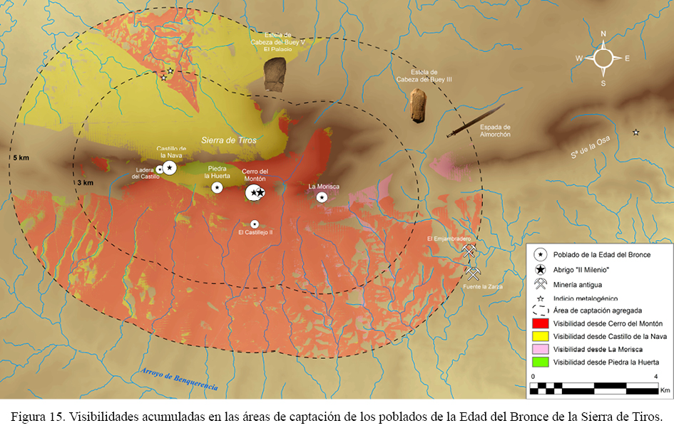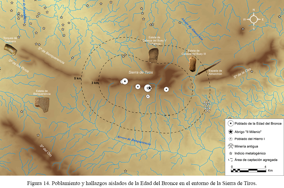 Desde esta perspectiva, una vez admitido el referente visual que es la Sierra de Tiros, perceptible a unos 50 kilómetros desde el valle Serena-Pedroches, el análisis espacial de las estelas aparecidas en su entorno pasa en primer lugar por definir el poblamiento sincrónico. Aunque, como hemos visto, disponemos solo de material de superficie para su valoración, es muy probable que sitios como El Montón, el Castillo de La Nava, La Morisca y Piedra la Huerta constituyan los mejores candidatos para ello. En todas las ocasiones se constatan ocupaciones en alto o dispuestas en las laderas meridionales más soleadas que puntualmente, como hemos podido apreciar en el extremo oriental de El Montón, exhiben elementos ideográficos pintados en plena sintonía con los de las estelas. Lejos de ser un detalle menor, esta circunstancia permite vincular culturalmente ambos conjuntos de evidencias, de manera que –con independencia de que tales poblados pudieran tener su origen en el Bronce Pleno o incluso antes– invita a contemplarlos también en un mismo plano cronológico, a grandes rasgos avalado por los fragmentos cerámicos recuperados en sus superficies y, en segundo plano, por otros hallazgos aislados cercanos, como la espada de lengua de carpa procedente al parecer del entorno de Almorchón.