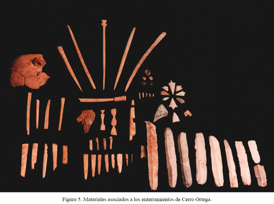 El hallazgo de aproximadamente 200 fragmentos de huesos de animales –algunos con fracturas en el hueso fresco destinadas probablemente a extraer la médula– junto a algunos carbones puede estar revelando la práctica de ritos de comensalidad cerca del lugar del enterramiento, a decir de sus excavadores. La presencia de fragmentos de cerámica elaborada a mano, entre los cuales destacan los de una ollita de borde entrante y mamelón perforado, puede estar en relación con esas prácticas (Benítez de Lugo 2018). En asociación con los huesos humanos fue encontrado un notable ajuar de hueso trabajado. Cabe destacar la presencia de largas varillas óseas de sección plana o redondeada –algunas con decoración en su extremo proximal– e idolillos antropomorfos esquematizados elaborados en hueso. No menos relevantes son los útiles de sílex amortizados en esta necrópolis: diez puntas de flecha con pedúnculo y aletas y, especialmente, nueve láminas con una longitud máxima de 17 cm, algunas con el filo retocado. Asimismo, fueron recuperados varios colgantes y cuentas, tanto de hueso como minerales: de clinocloro, clinoferrosilita y calcita (Odriozola Lloret et al. 2016). Todos los materiales fueron encontrados juntos acumulados en la misma unidad estratigráfica antes descrita (fig. 7).
