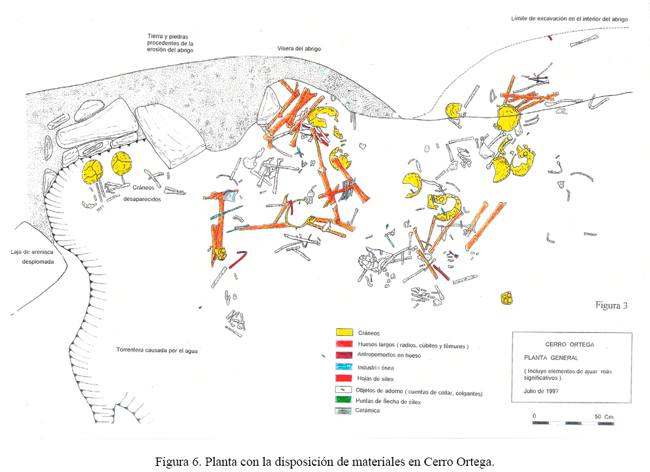 Las excavaciones arqueológicas desarrolladas en el abrigo situado al pie del Cerro Ortega (Villanueva de la Fuente, Ciudad Real) fueron dirigidas por Bienvenido Maquedano Carrasco y Carlos Barrio Aldea (Barrio Aldea y Maquedano Carrasco 2000). Sus estudios permitieron descubrir un depósito de huesos humanos sin conexión anatómica mezclados con abundantes restos de fauna (fig. 5). No se ha encontrado metal en el lugar.