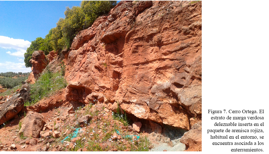 Los materiales arqueológicos no se encontraron en fosas de inhumación, sino enterrados en un estrato blando, relacionados con unas margas verdosas existentes en el corte de una pared de arenisca rojiza. Los restos humanos fueron dispuestos en esa especie de nicho o abrigo mediante acumulaciones selectivas distribuidas de forma intencionada: los huesos largos en una zona y los cráneos en otra (bajo la visera del abrigo). Los estudios antropológicos publicados revelaron el enterramiento en este lugar de un mínimo de 19 individuos, 12 de ellos adultos; su esperanza de vida media era de 40 años. Es interesante señalar que algunos de los huesos humanos largos presentan huellas de descarnamiento (fig. 6).