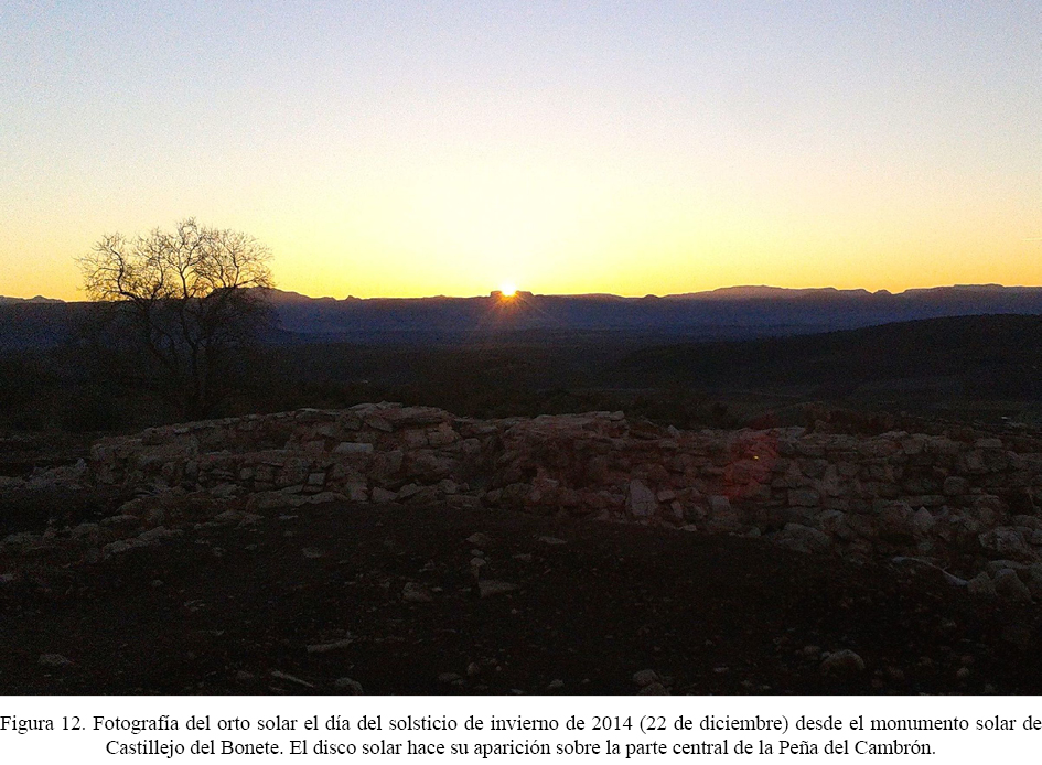 Desde este impresionante monumento se divisa una amplia panorámica de casi toda la mitad sur del horizonte, incluidas varias cumbres de las sierras de Alcaraz y del Segura hacia el sureste. Tras medir la posición de distintos puntos llamativos del horizonte que rodean al yacimiento y, a partir de cálculos sencillos de transformación de coordenadas (ecuación 5 de Esteban y Moret 2006: 171), se determinó su posible relación con los ortos u ocasos de los astros más importantes, detectando un hecho excepcional: la salida del Sol en el solsticio de invierno se debía producir por la montaña más llamativa que se divisa desde el lugar, la Peña del Cambrón, de 1550 m de altura, situada a unos 30 km de distancia hacia el sureste y que presenta un curioso perfil rectangular, con una cumbre plana y bordes rectos o muy inclinados. El día del solsticio de invierno de 2014, el 22 de diciembre, tuvimos la suerte de observar el amanecer desde el yacimiento con el cielo completamente libre de nubes y niebla. Obtuvimos fotografías y un vídeo con el que resulta posible comprobar que nuestros cálculos eran correctos. Ese día el Sol hizo su aparición por el centro de la Peña del Cambrón, con la montaña actuando como un marcador perfecto del solsticio de invierno (figs. 11 y 12).
