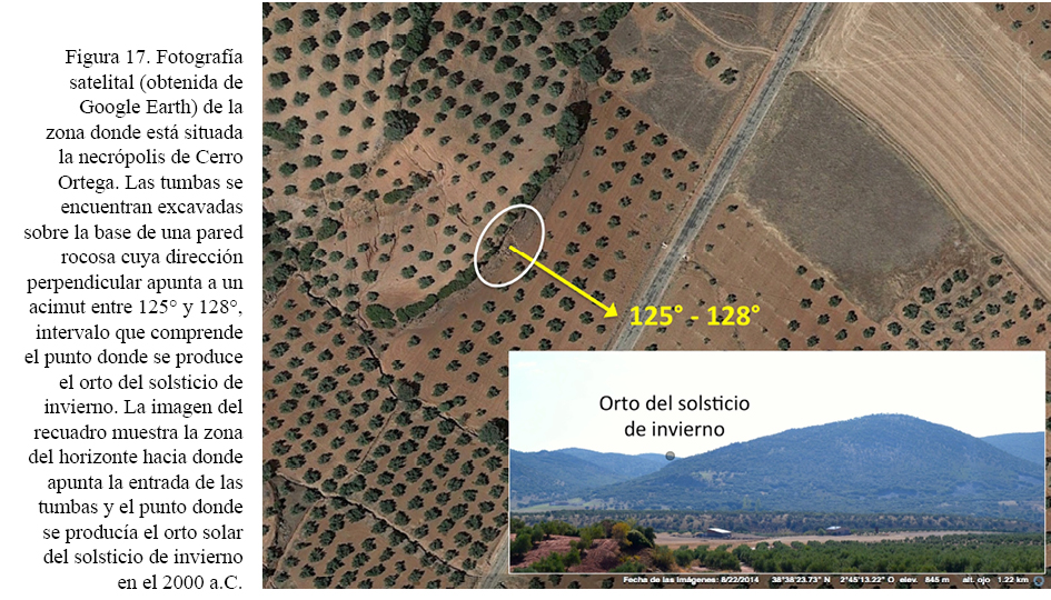 La dirección perpendicular a la pared rocosa justo en el lugar donde se encuentran las tumbas apunta a un intervalo de acimut comprendido entre 125° y 128° (ver fig. 17) que, proyectado sobre el horizonte local y considerando su altura, engloba el punto donde se produce el orto del solsticio de invierno (tanto en el 2000 a.C. como en la actualidad), que coincide con una de las cumbres de la cercana sierra del Relumbrar, situada en tercer (y último) plano y a unos 4 km de distancia. Como podemos ver en la fig. 17, la pared rocosa presenta distintas orientaciones a lo largo de toda su extensión, pero parecería que las tumbas se excavaron precisamente en la zona donde su entrada se orienta hacia dicho evento astronómico. Creemos que aunque este hecho, por sí solo, podría considerarse casual, el que coincida con el resultado astronómico principal de Castillejo del Bonete, el orto solar en el solsticio de invierno, sugiere que quizás ambas necrópolis compartan un mismo elemento del ritual funerario relacionado con el ciclo solar. Este hecho implicaría la pervivencia de elementos rituales en el mundo funerario de la zona desde, al menos, finales del Calcolítico hasta la Edad del Bronce.