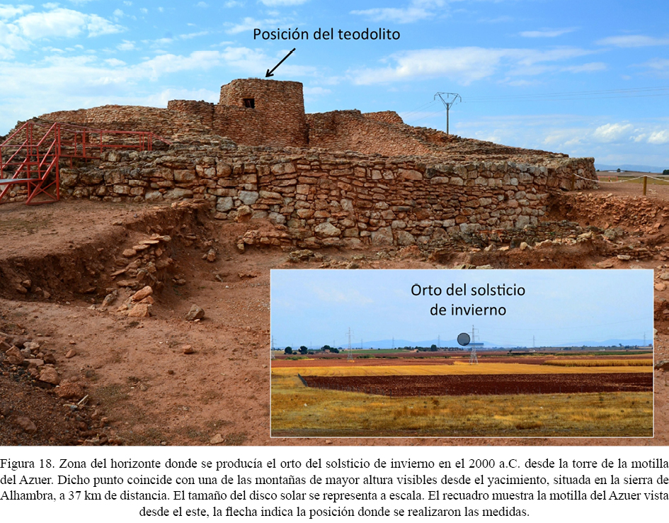 Este yacimiento se incluyó en nuestro trabajo arqueoastronómico por ser una de las motillas más representativas y para explorar su posible interés en este sentido. No se realizaron medidas de orientación de estructuras debido a que todas presentan geometría curvilínea, sin ejes de simetría evidentes que puedan definir direcciones. La visibilidad desde el yacimiento es muy amplia pero pobre en elementos topográficos destacables, al estar situado en una llanura de gran extensión. Las únicas montañas que se divisan en el horizonte son de escasa altura y están, en su mayoría, situadas al sureste (sierras de Alhambra y del Cristo), excepto un pequeño grupo hacia el noroeste (sierra de Malagón). El único resultado de interés astronómico que hemos encontrado en este yacimiento es que el orto del solsticio de invierno se produce sobre una de las mayores alturas que se divisan desde el yacimiento, en la sierra de Alhambra, situada a unos 37 km (fig. 18). Como en el caso de Cerro Ortega, la relación astronómica que encontramos en la motilla del Azuer no resulta llamativa y también podría ser fruto de la casualidad, pero es consistente al apuntar hacia el mismo evento astronómico que la mayoría de los yacimientos estudiados en el presente capítulo, el orto solar en el solsticio de invierno (fig. 18).