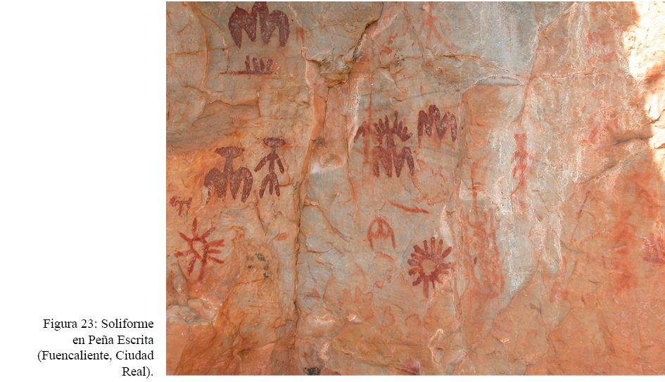 Antes de nuestro estudio arqueoastronómico, los únicos indicios de la presencia de elementos astrales en la simbología de la época y zona geográfica que nos ocupa provienen de algunas representaciones pictóricas. Al sur de La Mancha existen numerosos abrigos con arte rupestre esquemático. Es comúnmente aceptado que este tipo de grafías prehistóricas deben ser relacionadas con las primeras comunidades metalúrgicas de las edades del Cobre y del Bronce inicial (Fernández Rodríguez 2003: 277). El significado que tuvieron este tipo de manifestaciones aún no ha sido explicado satisfactoriamente, aunque algunos de ellos presentan representaciones que pueden interpretarse como astrales. Motivos soliformes han sido descritos, por ejemplo, en los paneles 3 y 4 de Peña Escrita o en La Golondrina (Fuencaliente, Ciudad Real) (Caballero Klink 1983, vol. I: 223 y vol. II: planos 81, 82 y 89; Fernández Rodríguez 2003: 193) o Callejones de Riofrío II (Mestanza, Ciudad Real) (ibidem: 218). La realización de estudios arqueoastronómicos sobre estos abrigos es una tarea pendiente (fig. 23).