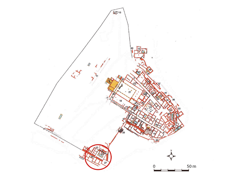 En caso de formar parte de la misma domus, dada la cota de esta planta, estos espacios podrían estar desempeñando funciones de servicio tales como almacenes y cocina, mientras servirían de base estructural para el piso superior situado a la cota del patio. Es posible que ambos pisos estuvieran conectados a través de una escalera, cuya caja no se ha conservado, pero que podría ubicarse en la estancia 6 por su morfología alargada y estrecha. Somos conscientes de la prudencia que exigen los restos conservados a la hora de elaborar una hipótesis de estas características, pero consideramos que la ubicación de ambas plantas y la técnica constructiva de la planta inferior podrían estar indicando una conexión entre ellas, a pesar de no haberse conservado el indicio material de una escalera (fig.7).