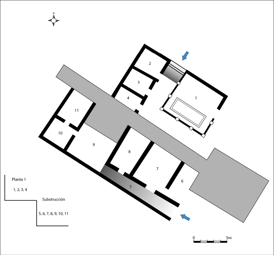 El acceso a los mismos se realizaría a través de un corredor (5), aparentemente de servicio, que haría las veces de distribuidor, dando acceso a tres grandes estancias (6, 7 y 8). Este pasillo termina en un espacio de tendencia cuadrangular (9), que podría funcionar como patio. A él se abre la estancia 10, que aparece conectada interiormente con la estancia 11, ya que no tiene vano abierto al espacio distribuidor 9, por lo que se define como una estancia auxiliar de la anterior.
