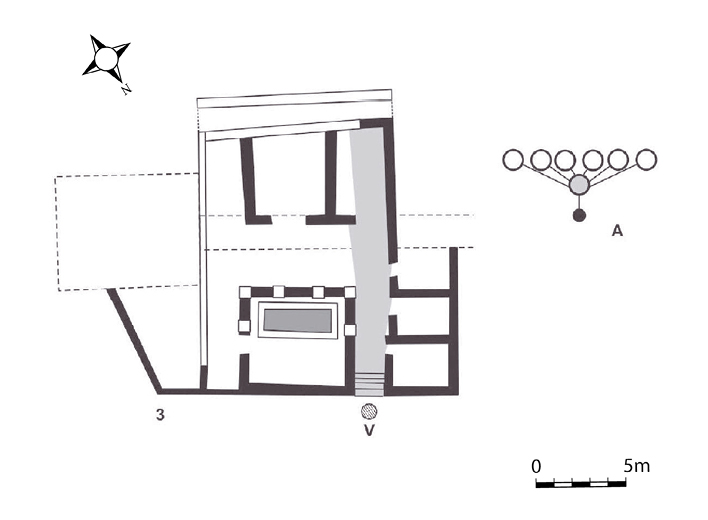 De ser así, la casa no cumpliría con el precepto de las “axial peristyle houses” de Meyer (1999: 102-103), por no contar con una alineación directa del acceso-peristilo/patio porticado-estancias de representación. Sin embargo, sus supuestas dimensiones y ubicación en planta, abiertas al lado largo del patio, ayudarían a identificarlas como como salas de representación (Olcina 2009: 106-108) y encajarían perfectamente en los análisis de accesibilidad (análisis gamma) y de visibilidad (isovistas) realizados por Sarabia (2013: 180) (fig.4).