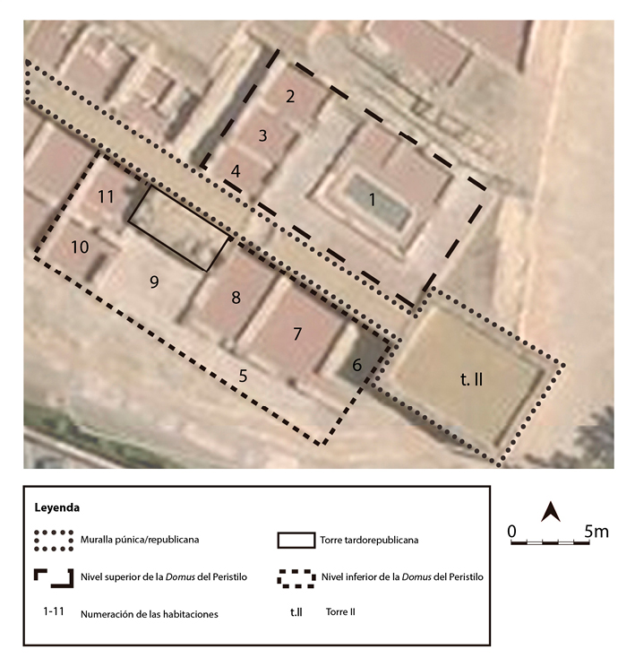 En conclusión, nos encontramos frente a un espacio doméstico altoimperial, de unos 400 m2 estimados, cuya morfología evidencia la gran cantidad de variables que intervienen en el diseño y construcción de una domus, siendo en este caso especialmente relevantes las cuestiones topográficas y de espacio edificable. Esta domus se construye superando la antigua muralla púnica, posteriormente republicana, que en época altoimperial se consideró obsoleta. Esta solución constructiva otorgó la posibilidad de crear dos niveles, que si bien no podemos afirmar con rotundidad que pertenecieron a la misma domus, a pesar de que tanto los materiales como las técnicas constructivas de ambos pisos sean los mismos, podemos estar seguros de que se encontraban interconectados por cuestiones logísticas. Para ello hemos llevado a cabo un estudio de las técnicas constructivas que vienen a confirmar, mediante el grosor de los muros del nivel inferior (60 cm, 10 cm más que los del primer nivel) y la presencia de sillares esquineros, que estos espacios extramuros sostendrían un primer nivel, conectado con el viario urbano, que en función de la lógica constructiva albergaría las estancias de representación ausentes y esperables en torno al patio porticado, que constituiría el distribuidor central de la vivienda.