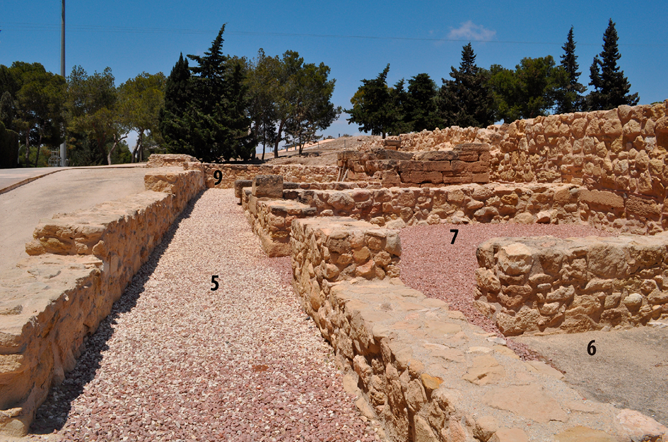 La zona al SE de la vivienda, que ocuparía el área de la torre II de origen púnico y el tramo de la muralla hasta la calle, es más compleja de interpretar. Aunque no nos es posible identificar su función, es difícil que no formara parte de esta vivienda. En ella podrían situarse un hortus o más estancias de representación, como ocurre en la Domus de la Puerta Oriental, que en su segunda fase se amplió al construir un patio con balsa de captación de agua sobre una de las torres (Olcina 2009: 106-108) (fig.6).