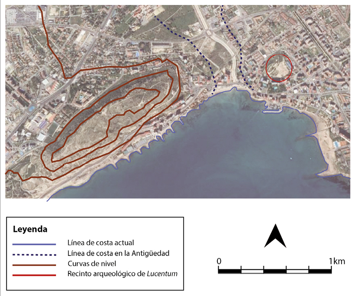 Situada sobre una colina a 38 m sobre el nivel del mar y a tan solo 3,5 km al NE del actual casco histórico de Alicante, la antigua ciudad de Lucentum (3 ha), destaca como una de las escasas ciudades romanas valencianas que no ha sufrido ningún expolio por las construcciones de épocas posteriores (Fernández 2000-2001: 215; Olcina 2006: 105).