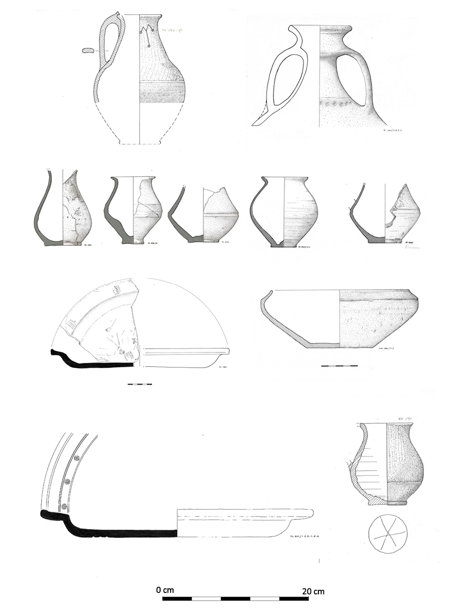 Producciones realizadas a mano o mediante sistemas de rotaciones lentas de cocciones mixtas muy irregulares y muy poco depuradas con desgrasantes de mediano y gran tamaño de cuarzo y mica. |