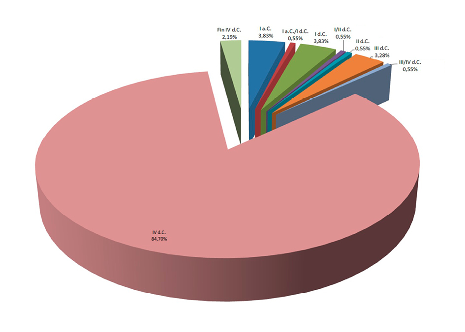 La tradicional cronología propuesta para el sitio ha generado un cierto consenso académico. De forma reiterada se ha datado el yacimiento en “época castrexa” con una importante ocupación en “época galaico-romana”, lo que equivalía a situar la ocupación del sitio entre la Segunda Edad de Hierro y un momento indeterminado entre los siglos IV y VI d. C., sin solución de continuidad aparente; si bien se ha venido restringiendo una ocupación “más intensa” entre los siglos II y V d. C. (con ligeros matices, es lo que se ha defendido en Arias Vilas 1996: 181; Arias Vilas y Fábregas Valcarce 2003: 194; Ayán Vila 2012; Caamaño Gesto y López Rodríguez 1984; Llana Rodríguez y Varela Arias 2001; Rodríguez Fernández 1994; Rodriguez Resino 2006: 170; Sánchez Pardo 2010a: 135). Una propuesta ligeramente distinta sería la de M.R. Lovelle y J.L. Quiroga, que extenderían la ocupación del sitio hasta el siglo VII e incluso el VIII d. C. (Lovelle y López Quiroga 2000: 60-64) , si bien en otro trabajo limitan su ocupación “desde finales del s.III hasta las primeras décadas del s.V” (López Quiroga y Lovelle 1999: 361). En cualquier caso, todas estas propuestas asumían una continuidad en la ocupación que, sin embargo, no corresponde con los análisis crono-estratigráficos realizados y que presentaremos en las siguientes secciones.